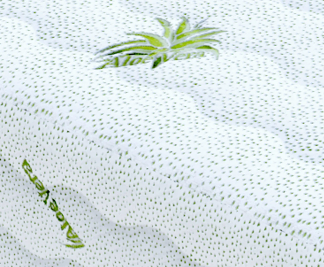 Der gesteppte Matratzenbezug Aloe zeichnet sich durch antiallergische und antibakterielle Eigenschaften aus, dank der Verwendung einer speziellen Faser bei seiner Herstellung. Seine Einzigartigkeit besteht darin, dass er mit dem durchblutungsfördernden und hautschonenden Extrakt aus Aloe Vera-Blättern getränkt ist. Sie bietet Schutz gegen das übermäßige Wachstum von Hausstaubmilben. Außerdem zeichnet sie sich durch ihre hervorragende Luftdurchlässigkeit aufgrund ihrer thermischen Eigenschaften aus. Sie ist die ideale Wahl für Räume, die stark von der Sonne beschienen werden, da sie die UV-Strahlung wirksam absorbiert.