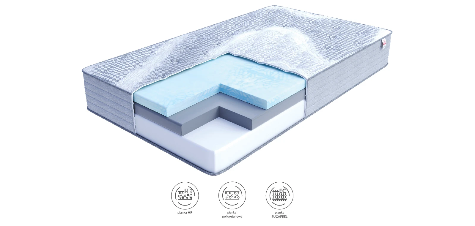 - Eucafeel - ist ein Schaumstoff in der obersten Schicht, der die Körpertemperatur um 1 Grad Celsius senkt. Dies sorgt für optimale Schlafbedingungen.
