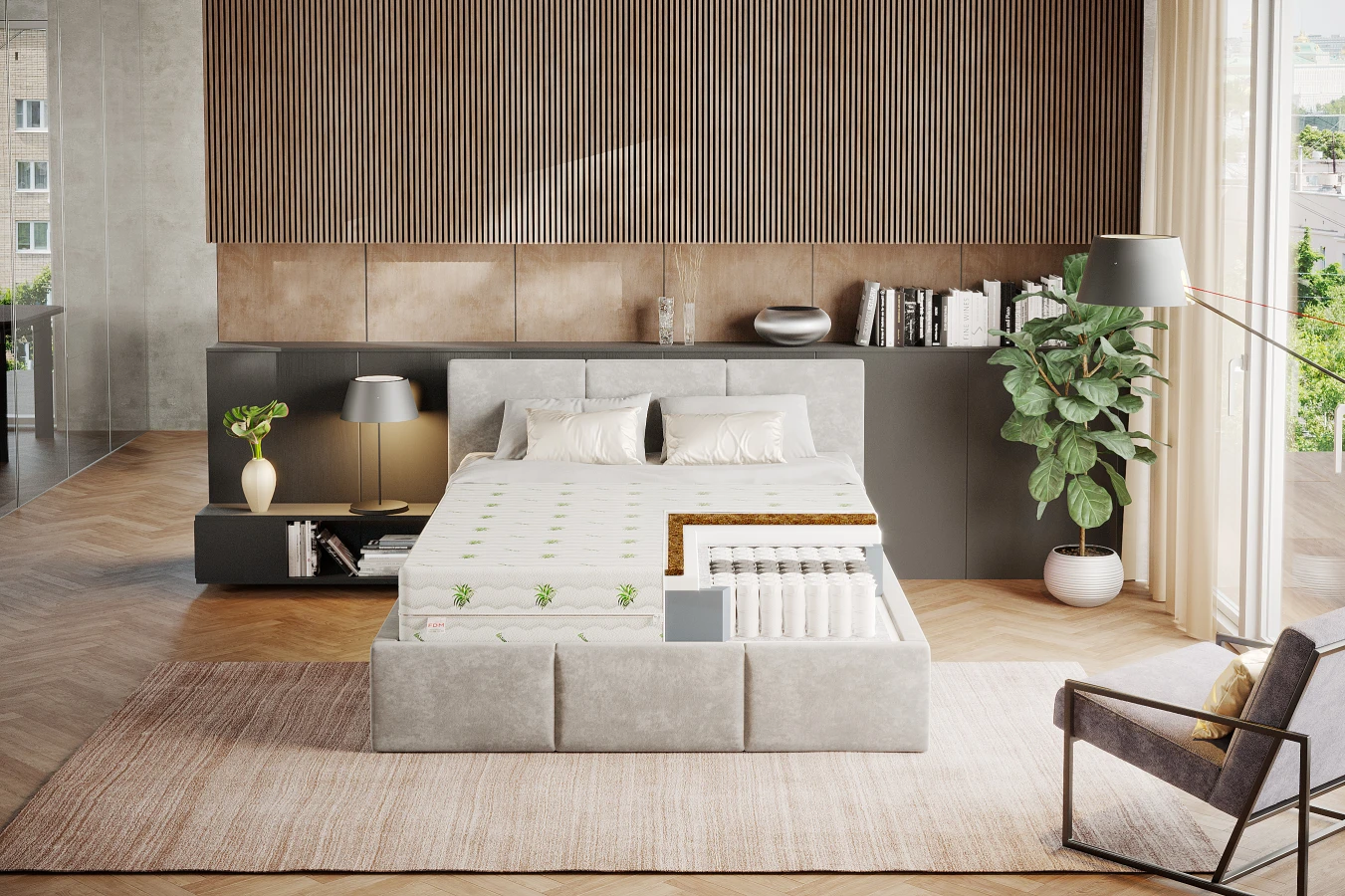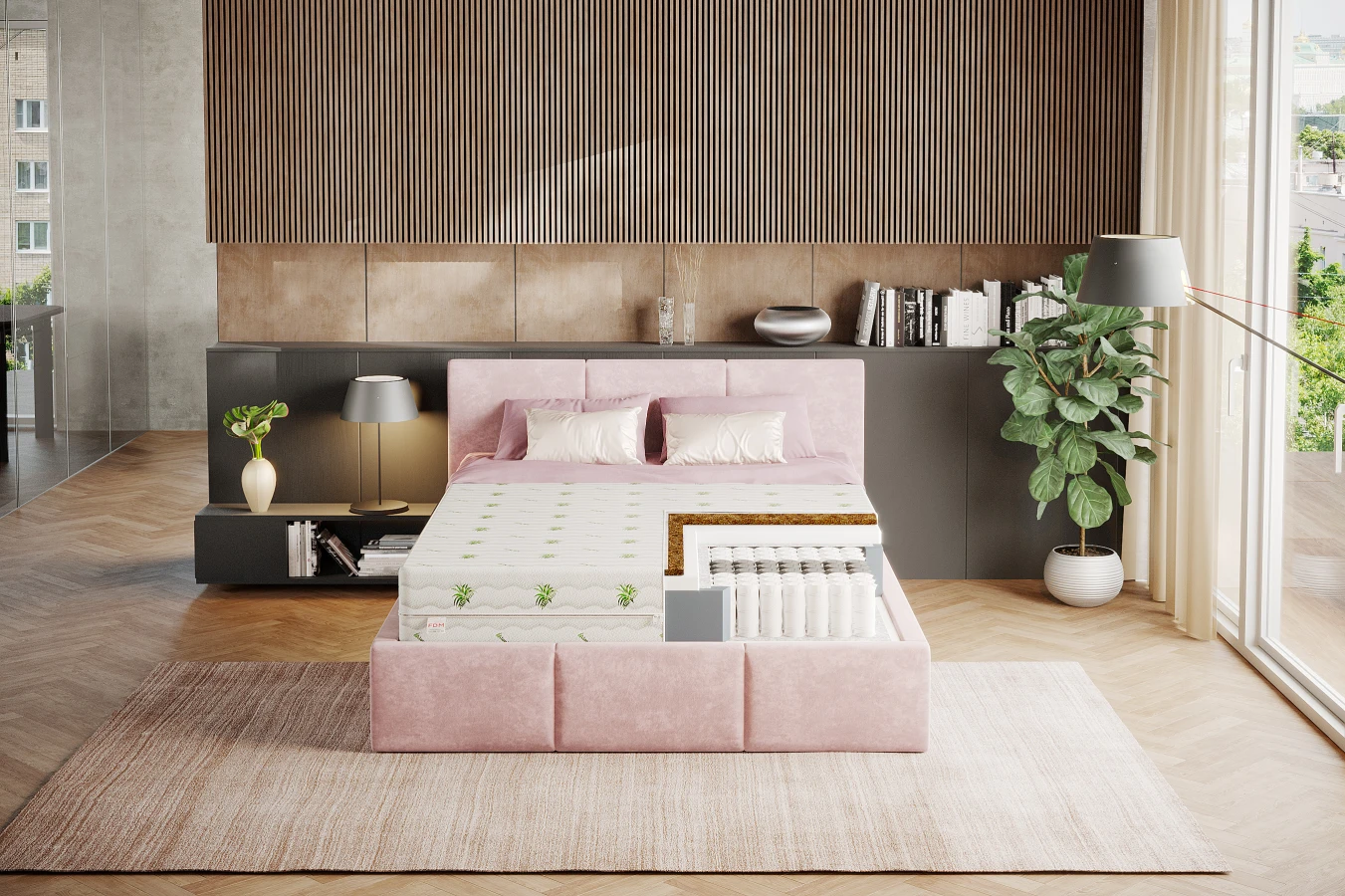 Das Modell BLISS ist eine außergewöhnliche Wahl für diejenigen, die sowohl Wert auf Gesundheit als auch auf Schlafkomfort legen. Die Klimafaser in Verbindung mit der Kokosnuss sorgt für eine gute Belüftung der Einlage, was die Vermehrung von Mikroorganismen, die allergische Reaktionen hervorrufen können, wirksam hemmt. Daher ist dieses Modell eine ausgezeichnete Wahl für Menschen, die mit Allergien zu kämpfen haben. Die Taschenbetten garantieren Komfort und eine gute Unterstützung der Wirbelsäule. Der größte Vorteil dieses Modells ist jedoch der ALOE VERA-Bezug. Der gesteppte ALOE VERA-Bezug hat antiallergische und antibakterielle Eigenschaften, da er aus einer speziellen Faser hergestellt ist. Darüber hinaus ist er in Aloe-Vera-Blattextrakt getränkt, der die Blutzirkulation fördert, sanft zur Haut ist und gleichzeitig vor der Ausbreitung von Hausstaubmilben schützt. Die hervorragende Belüftung sorgt dafür, dass die Matratze lange Zeit frisch bleibt.