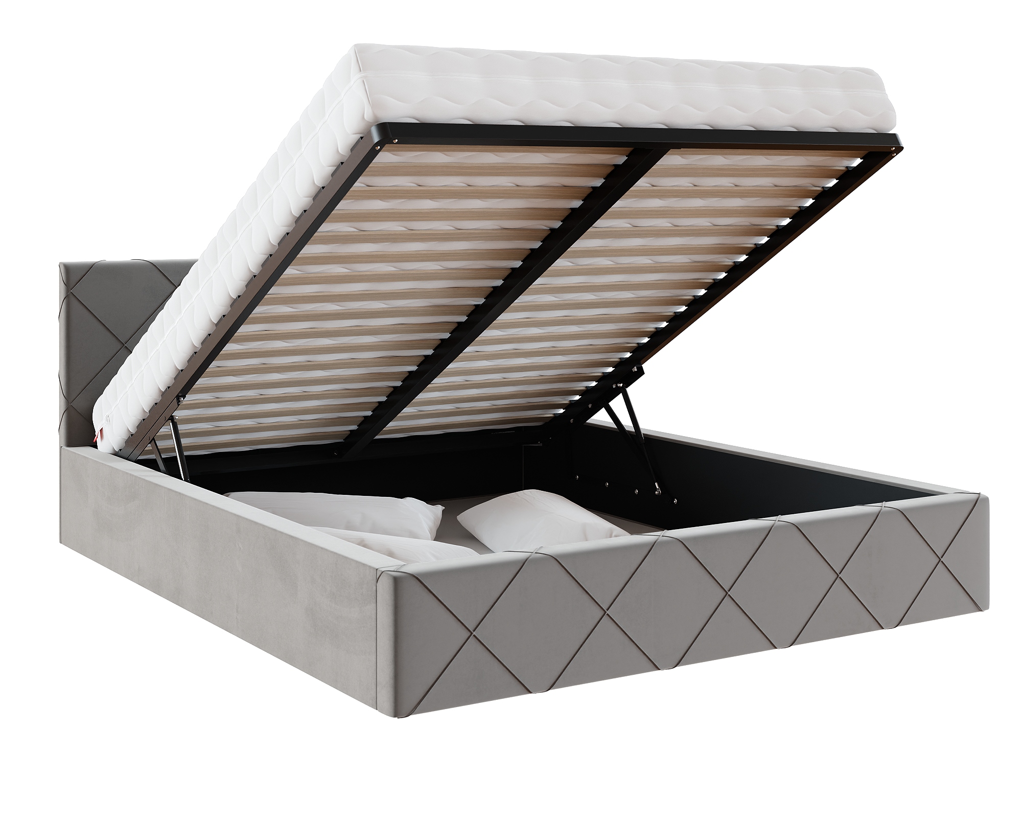 Das Polsterbett CARO ist mit einem erhöhten Metallrahmen ausgestattet. Dank zweier Gasflaschen lässt es sich leicht und ohne großen Kraftaufwand anheben. Die Latten des Rahmens sind im rechten Winkel angeordnet, so dass die darauf liegende Matratze gut belüftet ist und sich nicht verformt. So können sich weder Feuchtigkeit noch Hausstaubmilben festsetzen und wir können jede Nacht hygienische Schlafbedingungen genießen. Die in speziellen Halterungen untergebrachten Federleisten arbeiten mit der Matratze zusammen, was sich zusätzlich positiv auf den Komfort auswirkt. Sie sind so beschaffen, dass sie sich nicht ablösen oder abnutzen und viele Jahre lang halten.