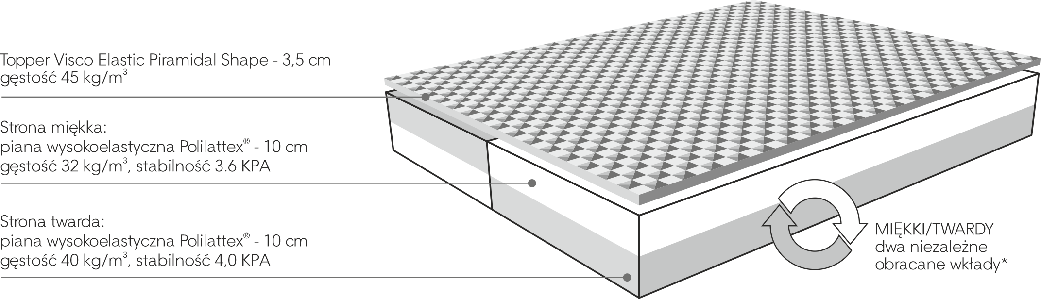 Die DIVERSO-Matratze ist so konzipiert, dass sie sich optimal an die Bedürfnisse des Benutzers anpasst. Sie verfügt über einen hochflexiblen Schaumstoff mit zwei Härtegraden - mittel und höher -, der es Ihnen ermöglicht, Ihren Schlafkomfort an Ihre persönlichen Vorlieben anzupassen.