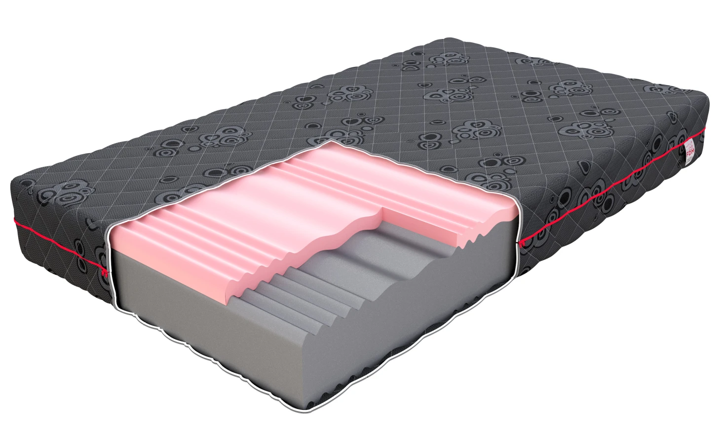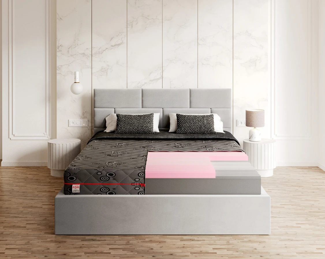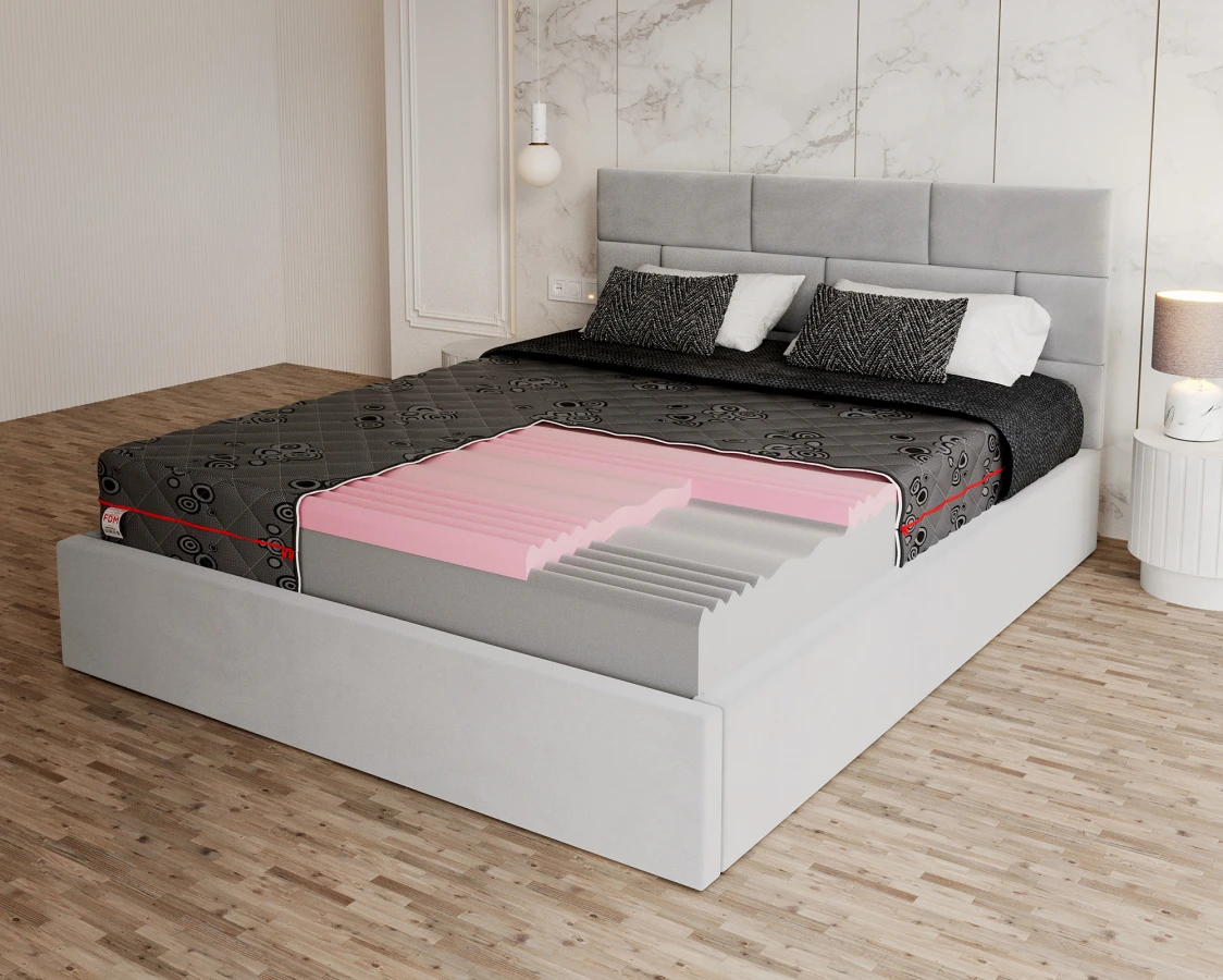 - Die erste Schicht ist ein profilierter Polyurethanschaum, der sich perfekt an die Figur des Benutzers anpasst und dessen konturierte Oberfläche die korrekte Position des Körpers während des Schlafs unterstützt. Dieser Schaumstoff ist elastisch, langlebig und verformungsbeständig; außerdem verhindert seine luftige Struktur eine Überhitzung und unterstützt Menschen mit Hausstaubmilbenallergien.
