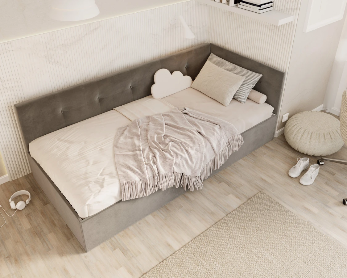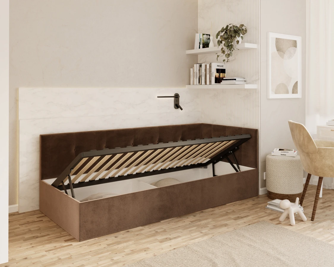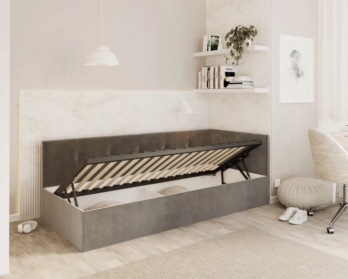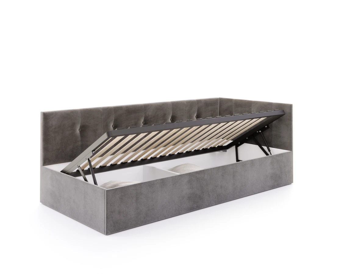 Sind Sie auf der Suche nach einem Bett, das modernen Stil mit der Funktionalität verbindet, die Sie jeden Tag brauchen? Das Modell EDDY 2 ist die Antwort auf die Bedürfnisse zeitgenössischer Innenräume - eine solide Konstruktion auf der Basis einer strapazierfähigen Möbelplatte garantiert Stabilität und Langlebigkeit, auch bei intensiver Nutzung.Der im Bett verwendete Metallrahmen mit einem System flexibler Birkenlatten stützt nicht nur die Matratze, sondern sorgt auch für ihre richtige Belüftung - der Schlüssel zur Aufrechterhaltung von Hygiene und Schlafkomfort für eine lange Zeit. Unter der gesamten Liegefläche befindet sich ein großer Bettzeugbehälter, in dem Decken, Kissen oder andere Textilien aufbewahrt werden können, was für mehr Ordnung sorgt und wertvollen Platz im Schlafzimmer spart.