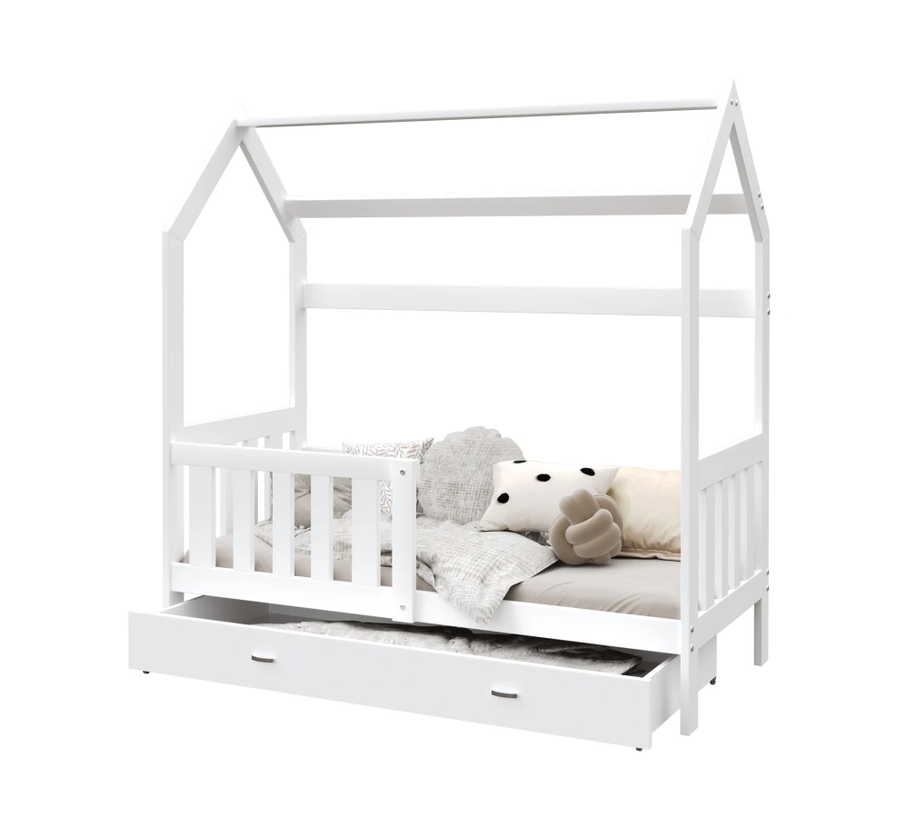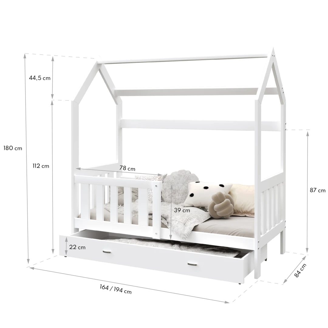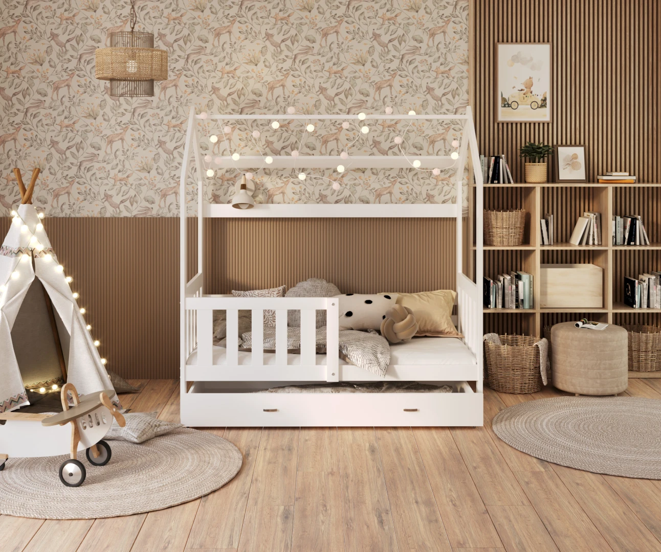 Das Landhausbett ELLIE hebt sich durch seine Funktionalität und sein einzigartiges Design ab. Hergestellt aus einer Kombination aus hochwertigem Kiefernholz und robusten MDF-Platten und beschichtet mit einem sicheren, umweltfreundlichen Lack auf Wasserbasis, gewährleistet es Sicherheit und Haltbarkeit für viele Jahre. Das unverwechselbare Vordach regt nicht nur die Fantasie der Kinder an, indem es ihnen erlaubt, ihren Raum durch Malen, Aufhängen von Vorhängen oder Maskottchen kreativ zu gestalten, sondern passt sich auch den wechselnden Bedürfnissen der Kinder an und wird so zu einem Ort zum Ausruhen, Spielen und Lernen. Darüber hinaus ist das ELLIE-Hüttenbett mit einer praktischen Schublade ausgestattet, die das Problem der Aufbewahrung von Bettzeug effektiv löst und Platz für Kissen, Bettdecke, Decke und Lieblingsplüschtiere bietet.