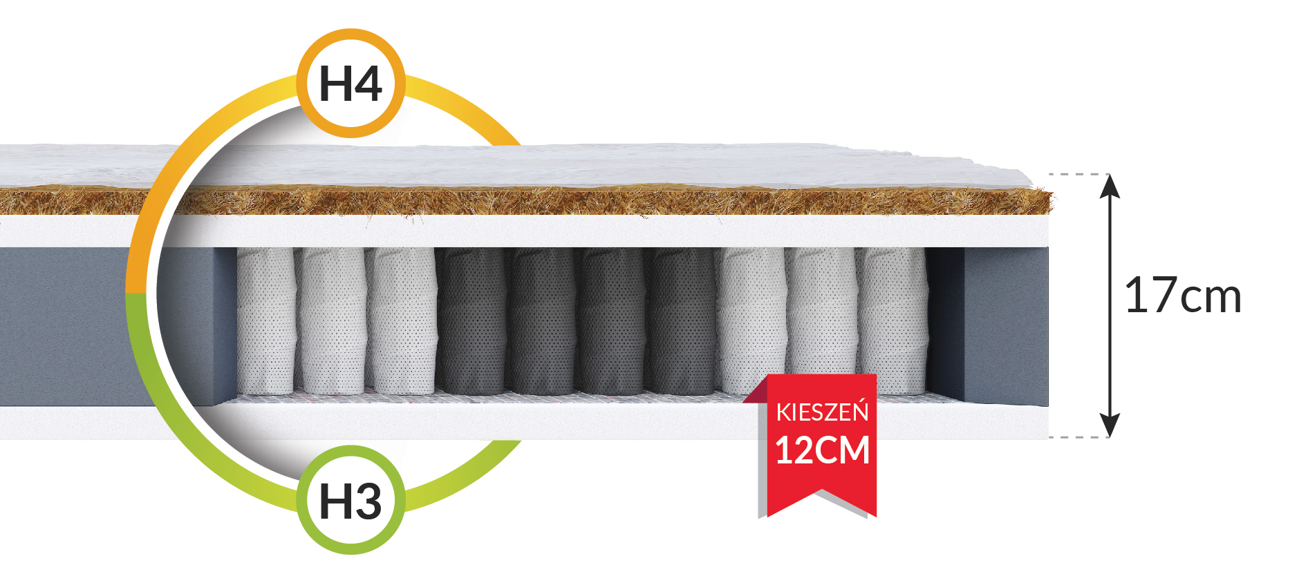 Wenn Sie morgens mit einem schmerzenden Rücken aufstehen und wissen, dass eine schlecht sitzende Matratze die Ursache dafür ist, wechseln Sie zum Modell Family! Dieses Produkt bietet Ihnen eine hervorragende Unterstützung der natürlichen Kurven Ihres Körpers und eine gesunde Ausrichtung der Wirbelsäule während des Schlafs. Wie bereits erwähnt, befindet sich jede der Federn in der Matratze in einer separaten Tasche und arbeitet unabhängig - die Oberfläche der Matratze passt sich punktuell an die einzelnen Körperteile der darauf liegenden Person an. Aber das ist noch nicht alles: Die Family-Matratze verfügt über 7 Stützzonen - was bedeutet das genau? Das Produkt ist in 7 Zonen mit unterschiedlichem Härtegrad unterteilt. Jede Zone ist auf eine bestimmte Körperpartie abgestimmt. Die Hüften, die schwer sind und in der Regel stärker in die Matratze einsinken, werden beim Modell Family stärker gestützt. Im Lendenbereich hingegen gibt das Produkt sanfter nach, damit die Wirbelsäule während der Nacht in ihrer natürlichen Position ruhen kann. Durch die 7 Zonen der Matratze wird der Härtegrad des Produkts an den Druck angepasst: