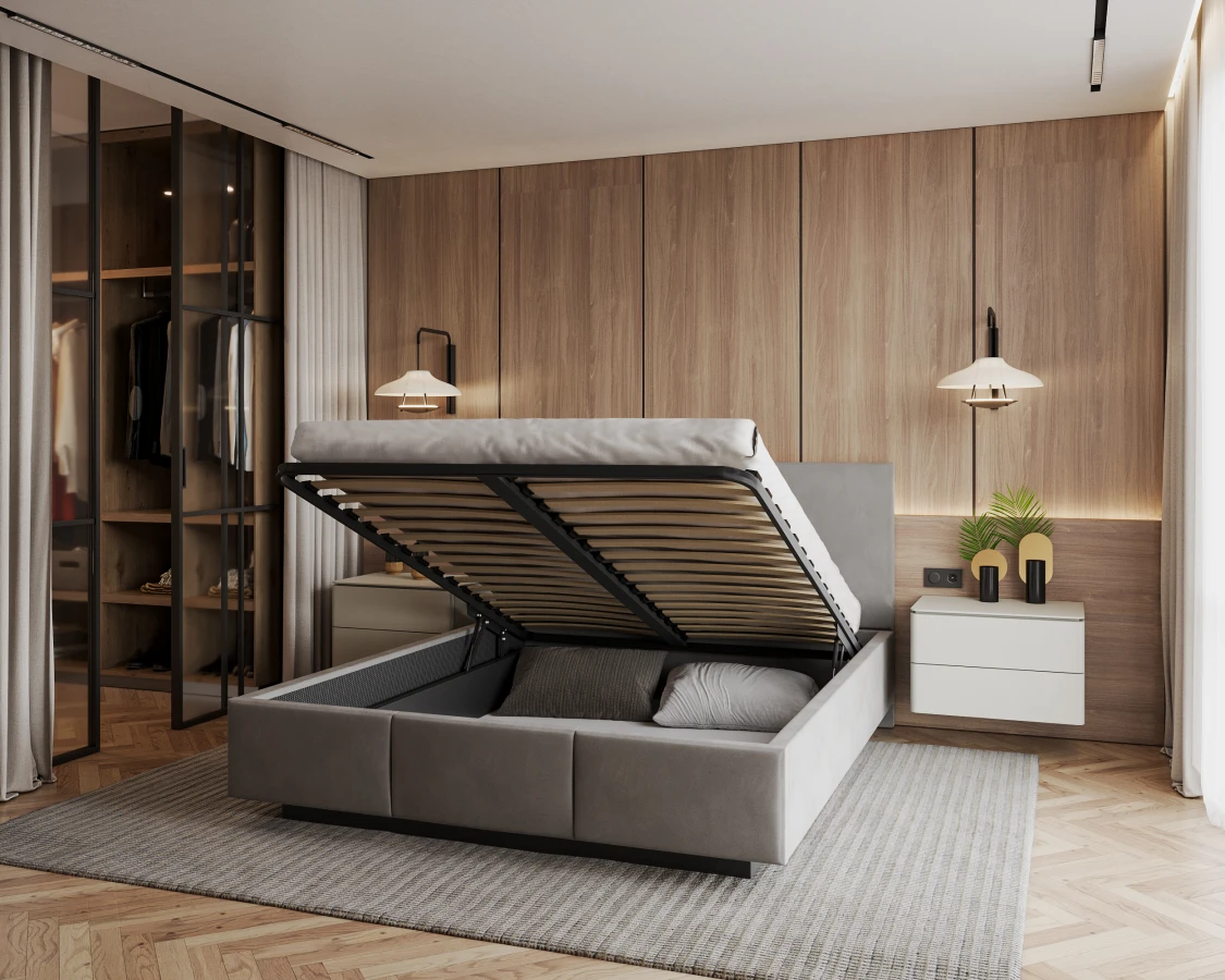 Um die Funktionalität des Bettes zu erhöhen, haben wir es mit einem Rahmen mit Hebemechanismus ausgestattet. Mit zwei Gasflaschen lässt sich der Rahmen leicht und ohne großen Kraftaufwand anheben. Die Latten des Rahmens sind so angeordnet, dass eine gute Belüftung der Matratze gewährleistet und eine Verformung verhindert wird. Diese Konstruktion sorgt dafür, dass die Matratze trocken und frei von Hausstaubmilben bleibt, was dazu beiträgt, jede Nacht hygienische Schlafbedingungen zu gewährleisten. Die Federleisten sind in speziellen Halterungen untergebracht, die sicherstellen, dass sie mit der Matratze zusammenarbeiten. Sie sind langlebig und widerstandsfähig, so dass Sie viele Jahre lang Freude an ihnen haben werden.