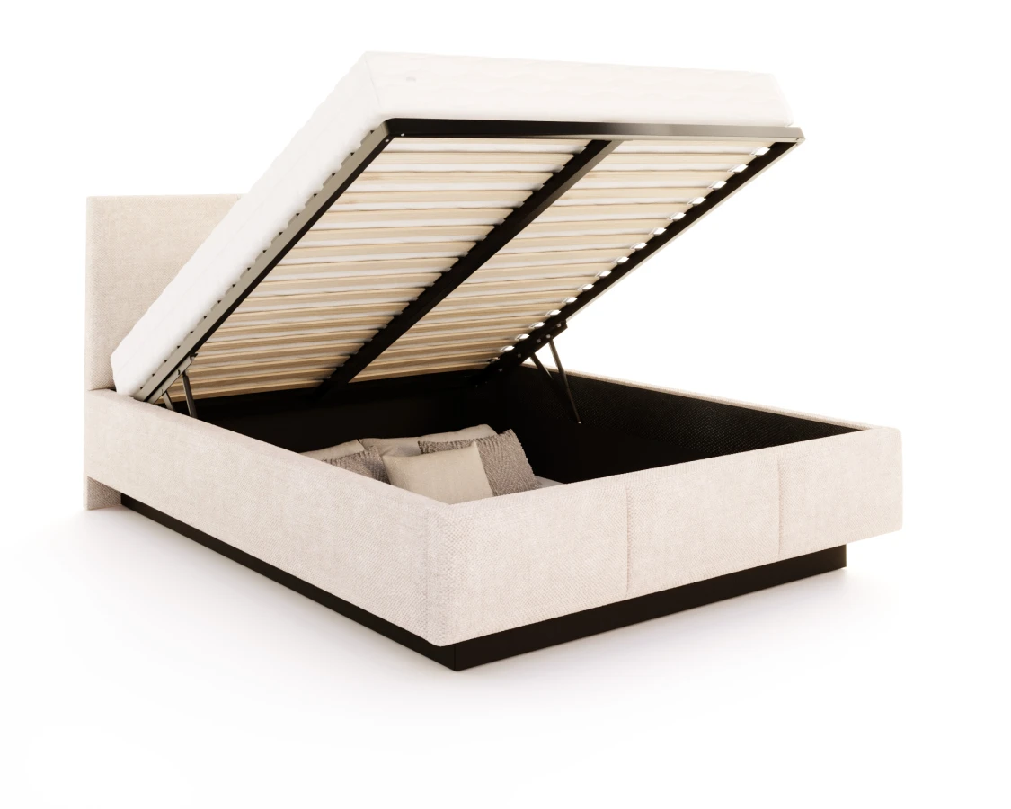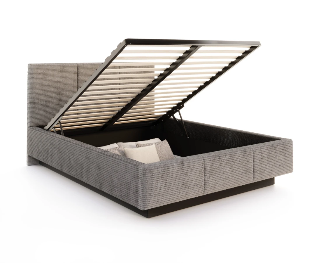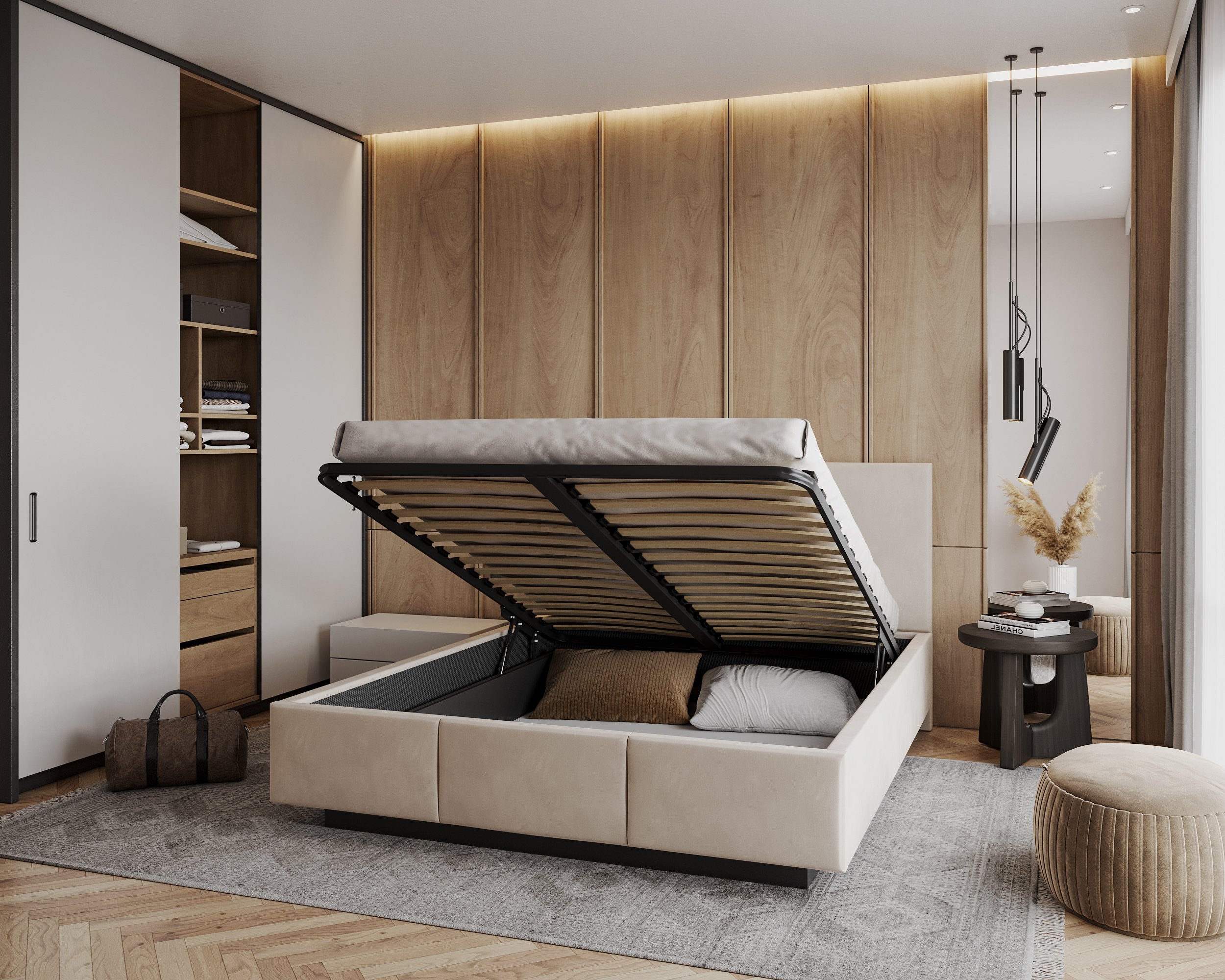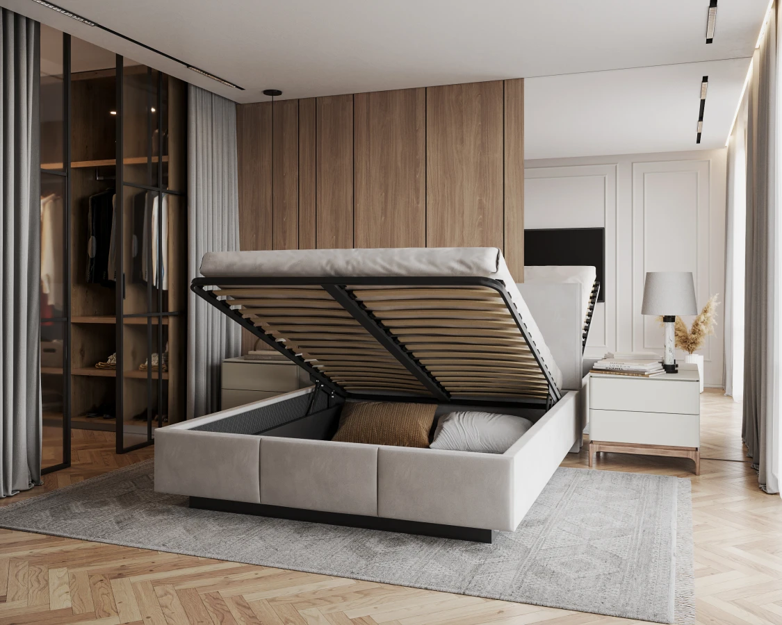 Jedes Bett sollte Komfort mit Funktionalität verbinden. Das Modell AVEIRO, das mit einem Heberahmen ausgestattet ist, bietet einen tiefen, leicht zugänglichen Bettzeugbehälter. Mit dieser Lösung gewinnen Sie zusätzlichen Platz, der ideal für die Aufbewahrung verschiedener Gegenstände ist. Der Behälter steht direkt auf dem Boden, so dass auch schwere Gegenstände sicher gelagert werden können und die Gefahr des Einsinkens des Bodens ausgeschlossen ist. So ist das Bett AVEIRO nicht nur ein bequemer Ruheplatz, sondern auch ein praktisches und geräumiges Einrichtungsstück, das dank seiner soliden Konstruktion jahrelang haltbar ist und sich mit seinem modernen Design perfekt in verschiedene Einrichtungsstile einfügt. Es ist eine ideale Wahl für alle, die Wert auf Ordnung und Ästhetik legen.