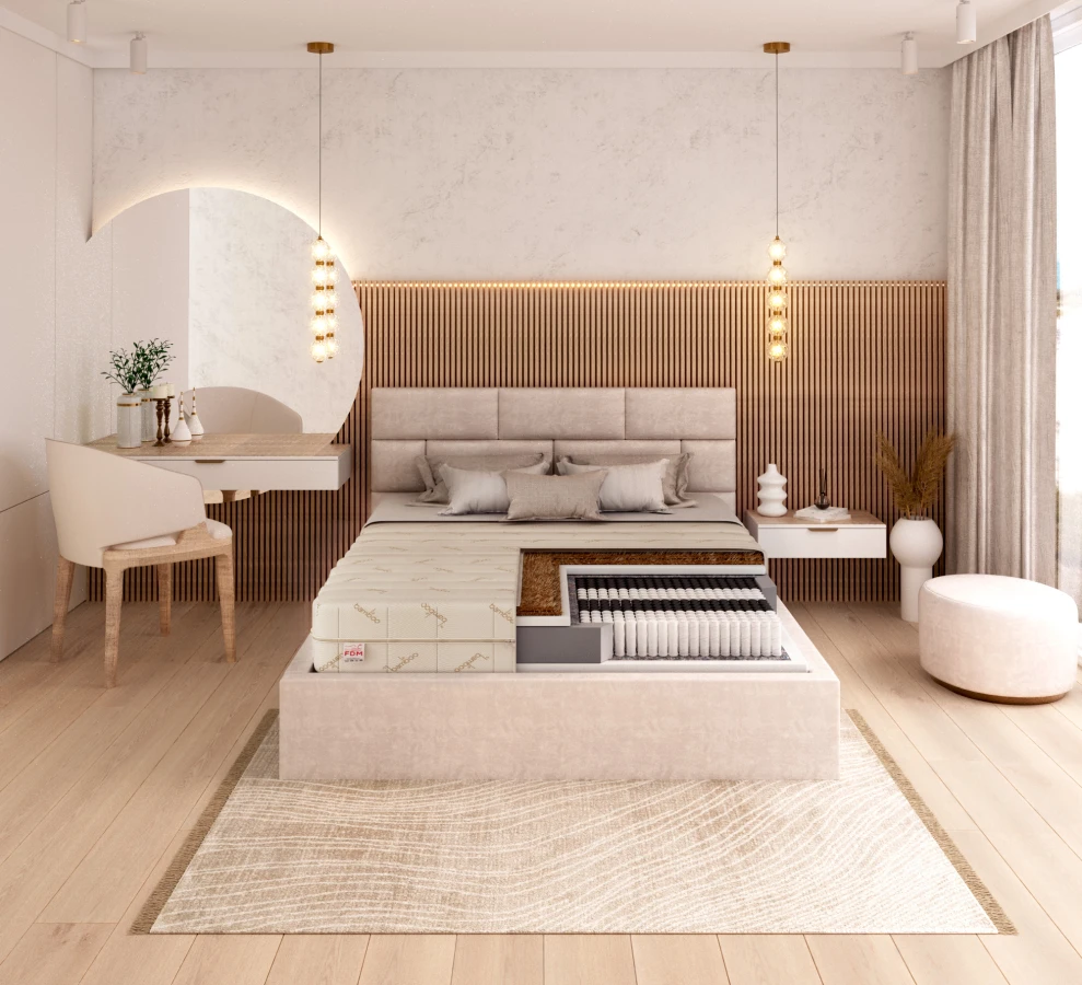 Die GRADO-Matratze verfügt über eine doppelte Kokoseinlage, die die Oberfläche zusätzlich versteift. Außerdem fördert sie die Luftzirkulation und minimiert so das Risiko von übermäßigem Schwitzen in der Nacht. Die Kokosnuss macht die gesamte Matratze atmungsaktiv, wodurch das Wachstum von Schimmel, Pilzen und anderen Allergenen erheblich erschwert wird. Der Polyurethanschaum stabilisiert die gesamte Struktur und stützt die gesamte Wirbelsäule während der Nachtruhe gut ab. Mit einer Schicht aus Kokos und Polyurethan ist GRADO für diejenigen geeignet, die feste und sehr feste Matratzen bevorzugen.