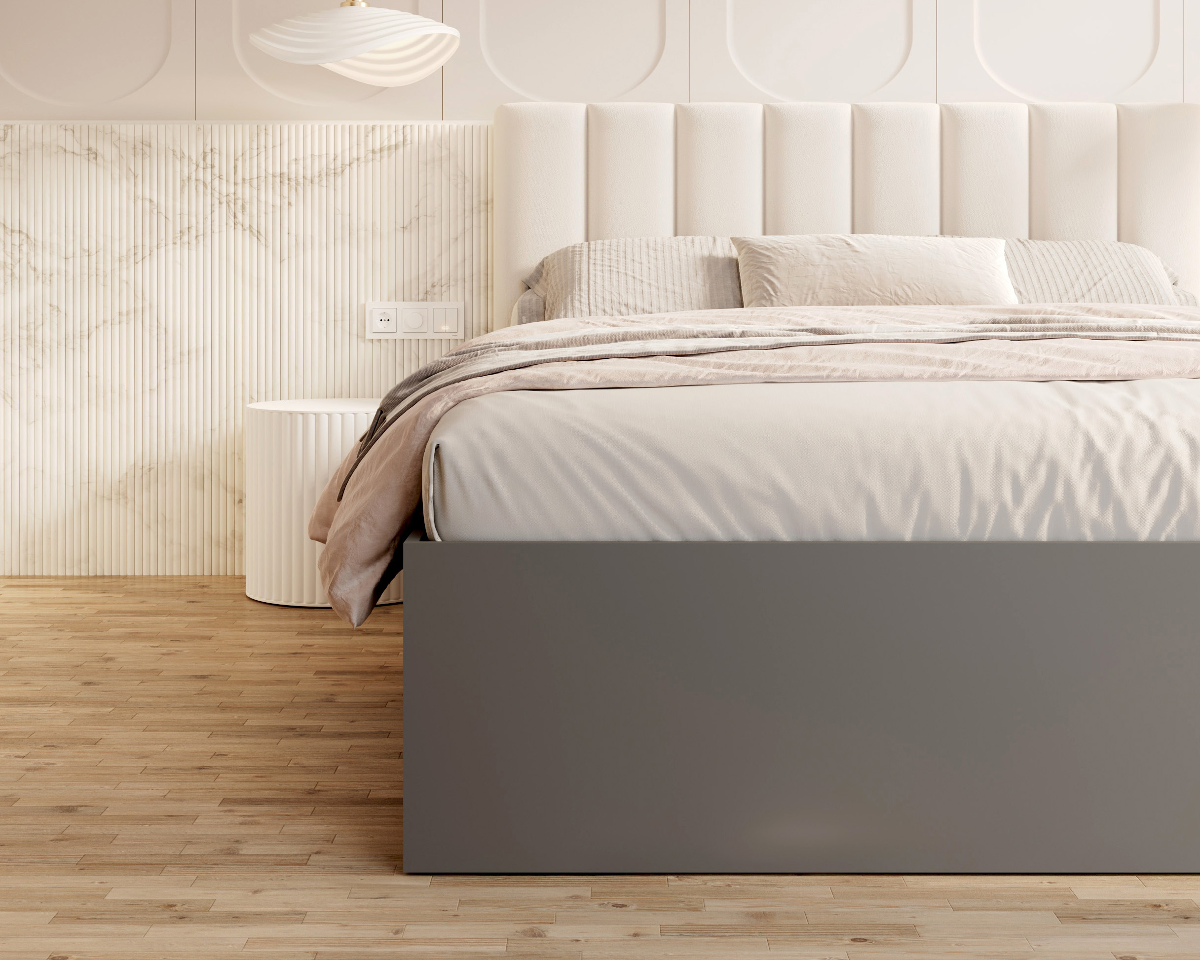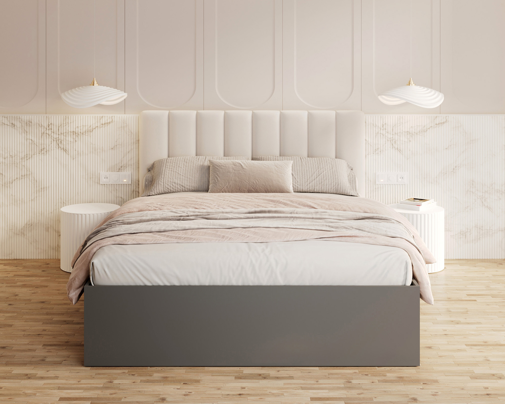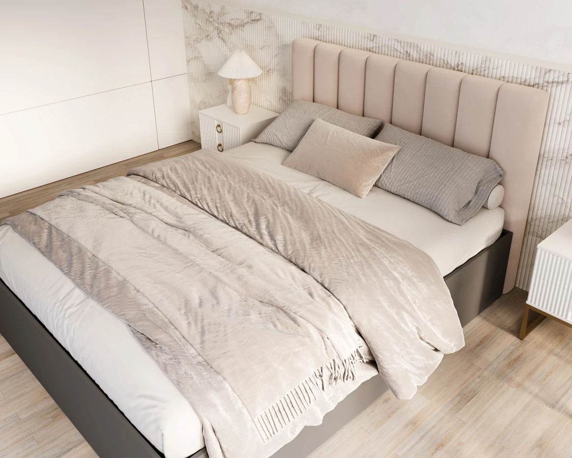 Das Prunkstück des Bettes GRENADA ist das elegante, weich gepolsterte Kopfteil, das nicht nur ein Blickfang ist, sondern auch eine bequeme Stütze bei einem entspannten Abend mit einem Buch oder einer Fernsehserie bietet. Die Polsterung besteht aus den hochwertigen Stoffen TRINITY, PARIS und BOUCLE, die jeweils in einer breiten Farbpalette von gedeckt bis intensiv und dekorativ erhältlich sind. Diese Stoffe vereinen eine angenehme Haptik mit einer hohen Abrieb- und Fusselbeständigkeit und sind damit eine hervorragende Wahl für ein täglich genutztes Schlafzimmer. Der moderne Look wird durch eine Kommode aus strapazierfähigem MDF in mattem Weiß ergänzt - die minimalistische Form steht in perfektem Kontrast zur farbenfrohen Polsterung des Kopfteils, wodurch ein vielseitiges und stilvolles Möbelstück entsteht. GRENADA ist ein Vorschlag, der sich harmonisch in viele Einrichtungsstile einfügt - von skandinavischer Schlichtheit über klassische Eleganz bis hin zum industriellen Loft.