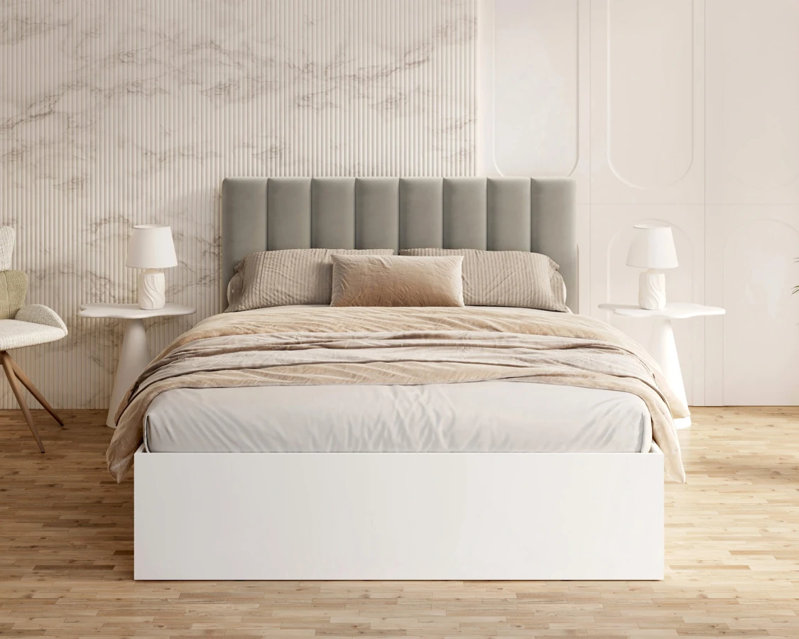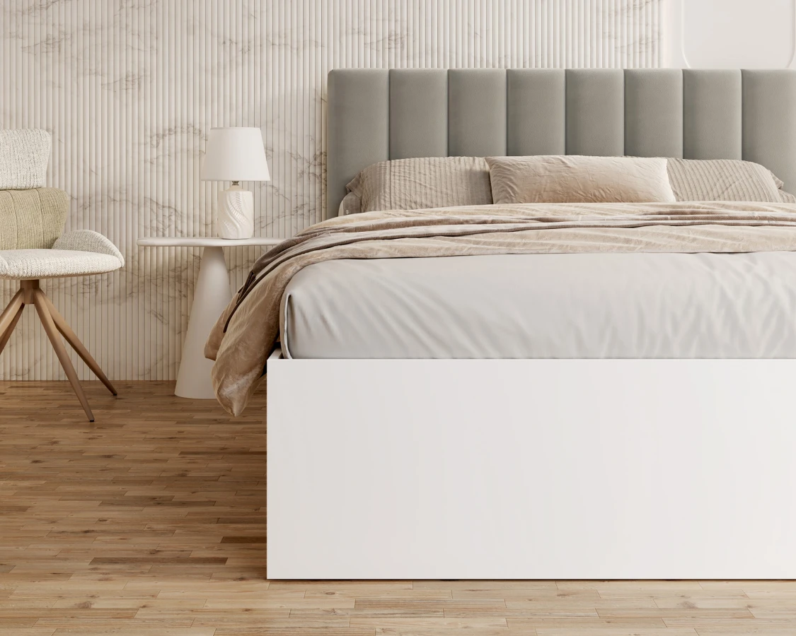 Das Prunkstück des GRENADA-Bettes ist das elegante, weich gepolsterte Kopfteil, das nicht nur ein Blickfang ist, sondern auch eine bequeme Stütze bei einem entspannten Abend mit einem Buch oder einer Fernsehserie bietet. Die Polsterung ist aus den hochwertigen Stoffen TRINITY, PARIS und BOUCLE gefertigt, die jeweils in einer breiten Farbpalette von gedeckt bis intensiv und dekorativ erhältlich sind. Diese Stoffe vereinen eine angenehme Haptik mit einer hohen Abrieb- und Fusselbeständigkeit und sind damit eine hervorragende Wahl für ein täglich genutztes Schlafzimmer. Der moderne Look wird durch eine Kommode aus strapazierfähigem MDF in mattem Weiß ergänzt - die minimalistische Form steht in perfektem Kontrast zur farbenfrohen Polsterung des Kopfteils, wodurch ein vielseitiges und stilvolles Möbelstück entsteht. GRENADA ist ein Vorschlag, der sich harmonisch in viele Einrichtungsstile einfügt - von skandinavischer Schlichtheit über klassische Eleganz bis hin zum industriellen Loft.