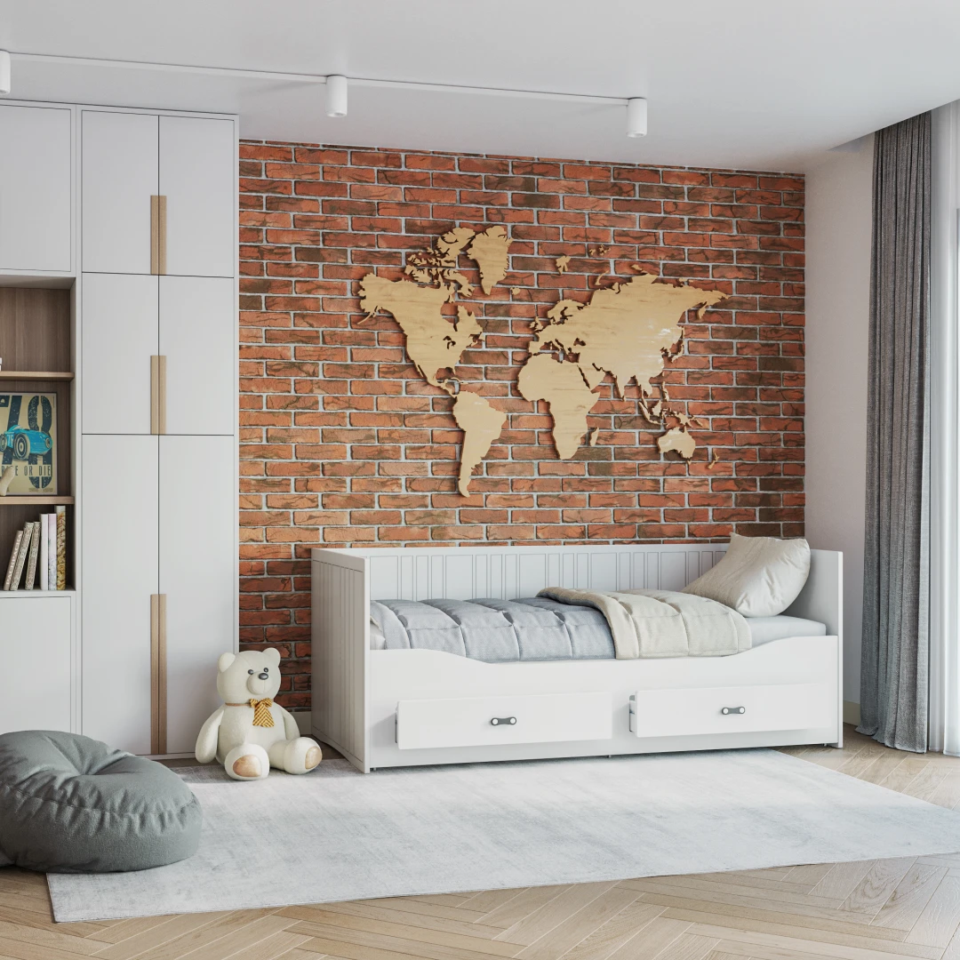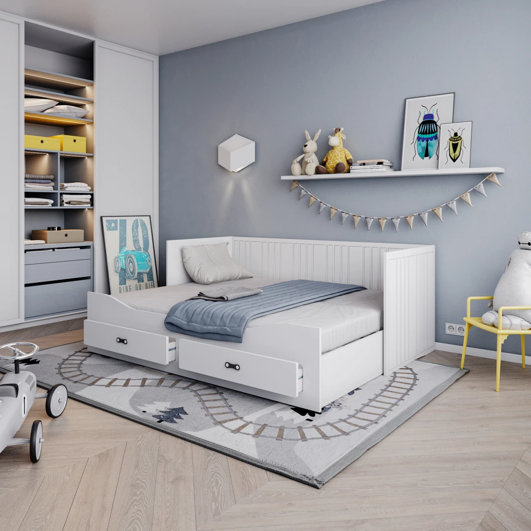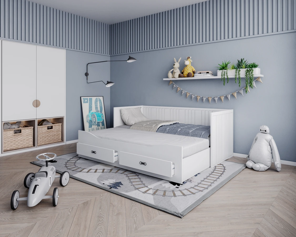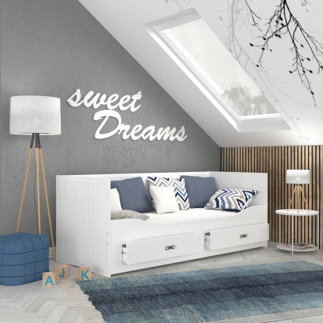Das Kinderbett HARPER mit Schubladen lässt Sie die Probleme mit der Aufbewahrung von Bettzeug vergessen. In den geräumigen Schubladen finden Kissen, Bettdecke, Decke und die Lieblingsmaskottchen des Kindes problemlos Platz. HARPER zeichnet sich durch sein originelles Design, seine Ästhetik und seine Schlichtheit aus. Der minimalistische skandinavische Stil passt in fast jedes Kinder- und Jugendzimmer. Die einheitliche Oberfläche des Bettes macht die Reinigung zu einem Kinderspiel. Das weiße Furnier passt zu jeder Zimmerfarbe.