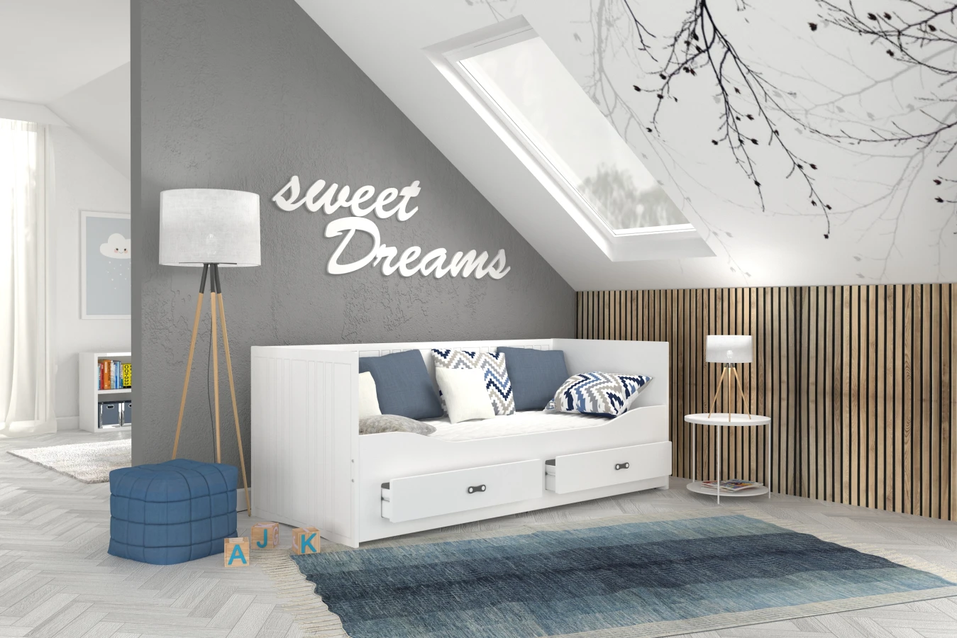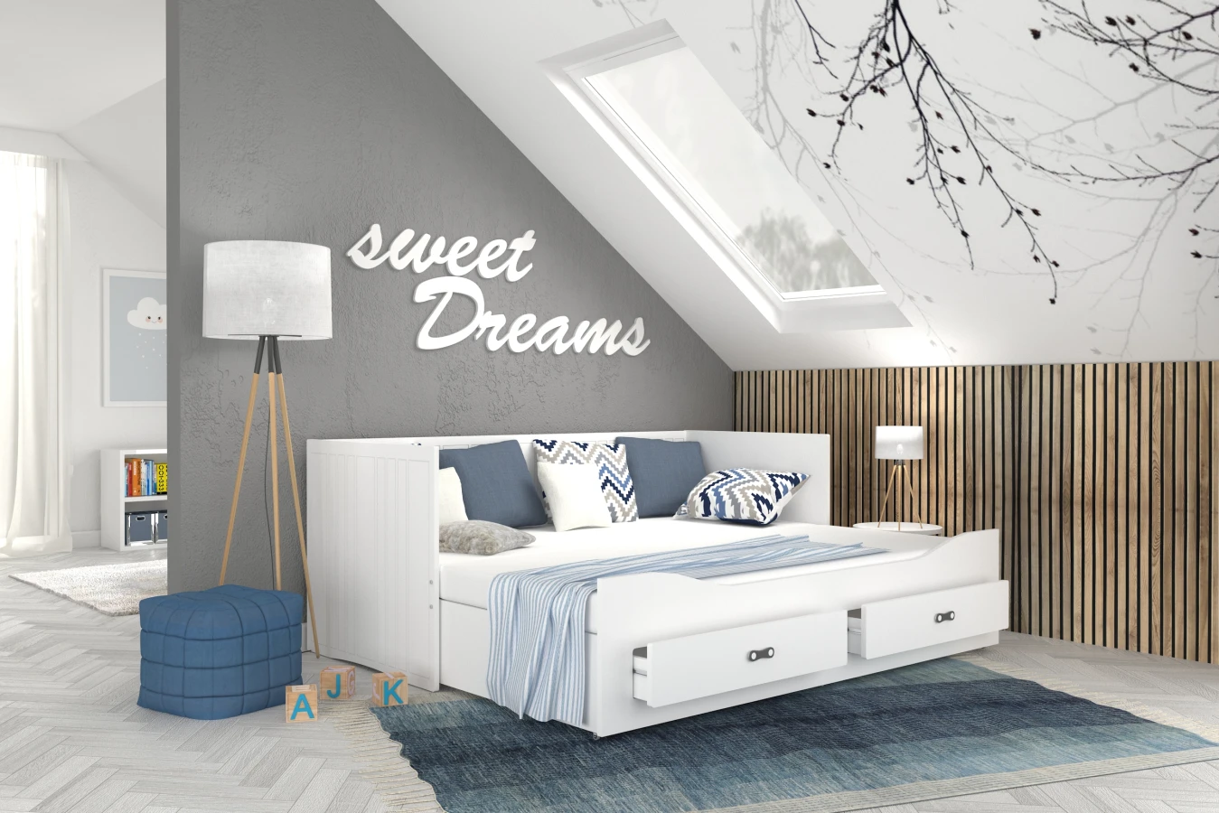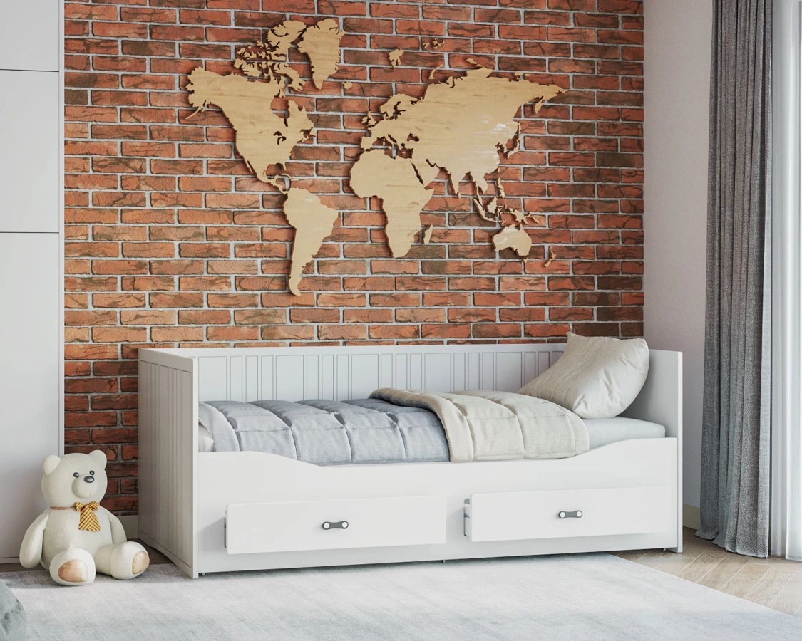 Das Kinderbett HARPER mit Schubladen lässt Sie die Probleme mit der Aufbewahrung von Bettzeug vergessen. In den geräumigen Schubladen finden Kissen, Bettdecke, Decke und die Lieblingsmaskottchen des Kindes problemlos Platz. HARPER zeichnet sich durch sein originelles Design, seine Ästhetik und seine Schlichtheit aus. Der minimalistische skandinavische Stil passt in fast jedes Kinder- und Jugendzimmer. Die einheitliche Oberfläche des Bettes macht die Reinigung zu einem Kinderspiel. Das weiße Furnier passt zu jeder Zimmerfarbe.