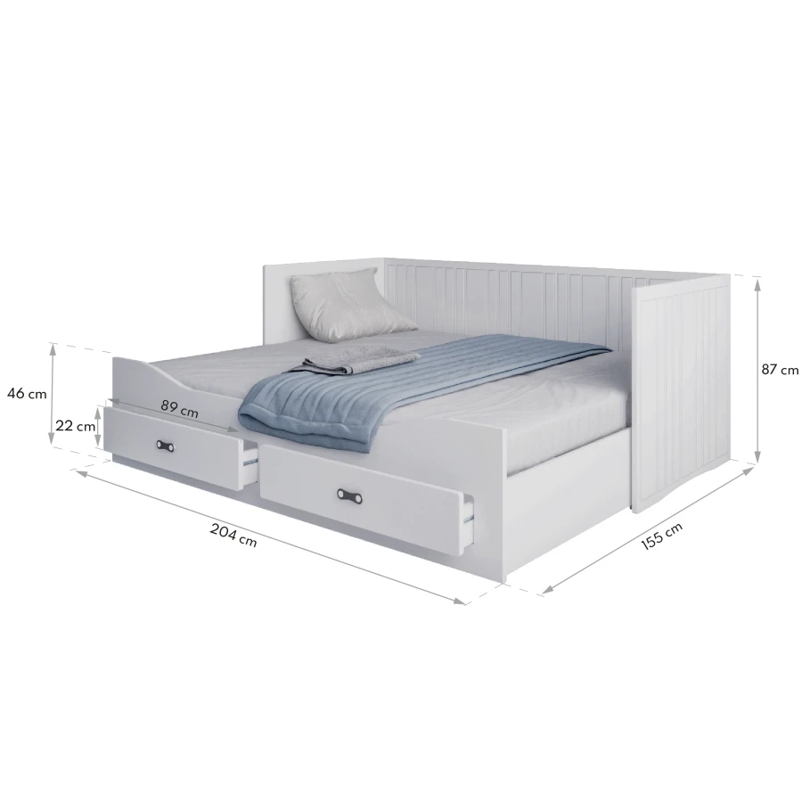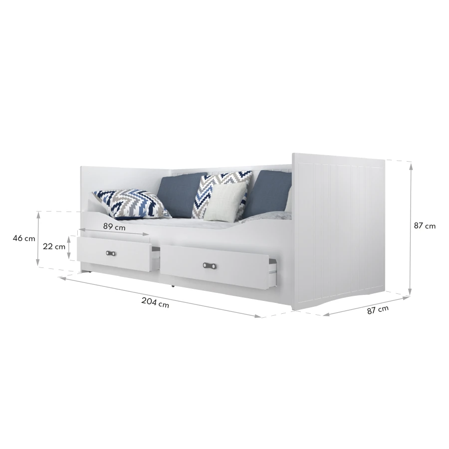 Das Bett HARPER istideal für das Kinderzimmer, aber auch für das Gästezimmer oder das Wohnzimmer. Es ist im skandinavischen Stil gehalten und verleiht jeder Einrichtung einen gemütlichen Touch. Darüber hinaus ist es funktional und langlebig. Dank der Möglichkeit, es auszuklappen, bietet es eine bequeme Liegefläche, während es im zusammengeklappten Zustand den Platz im Raum nicht einschränkt. Zwei praktische Schubladen bieten Stauraum für Kleinigkeiten, und dank der mitgelieferten Matratzen ist das Bett nach dem Zusammenklappen sofort einsatzbereit. Das Klappbett HARPER ist eine gute Wahl für Kinder und Jugendliche, da es sich an ihre wechselnden Bedürfnisse anpasst. Es bietet sowohl Komfort als auch Funktionalität für den täglichen Gebrauch. Durch die Ausklappbarkeit kann es tagsüber als Einzelbett genutzt werden, was den Spielraum vergrößert, und nach Einbruch der Dunkelheit lässt es sich leicht in ein Doppelbett verwandeln, das mehr Platz zum Entspannen bietet.