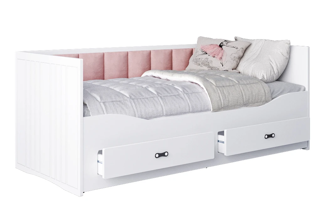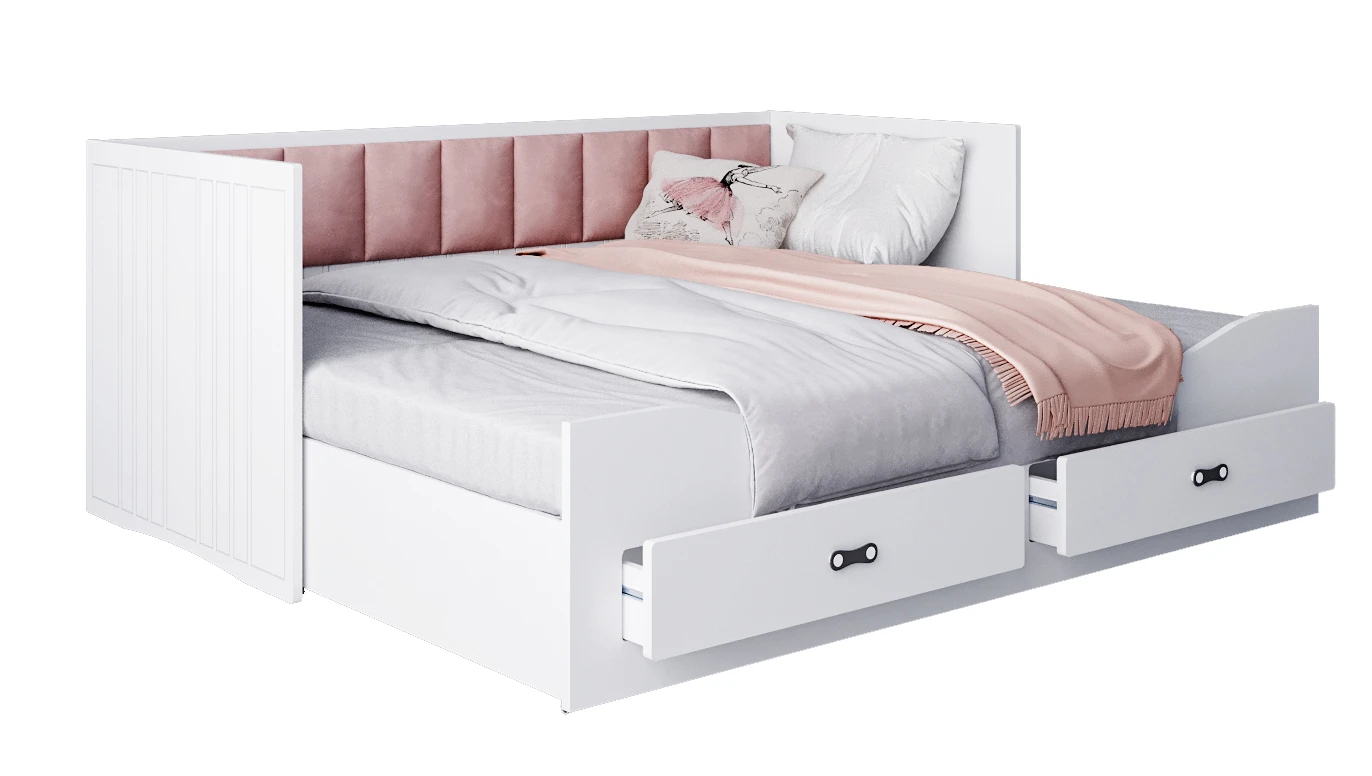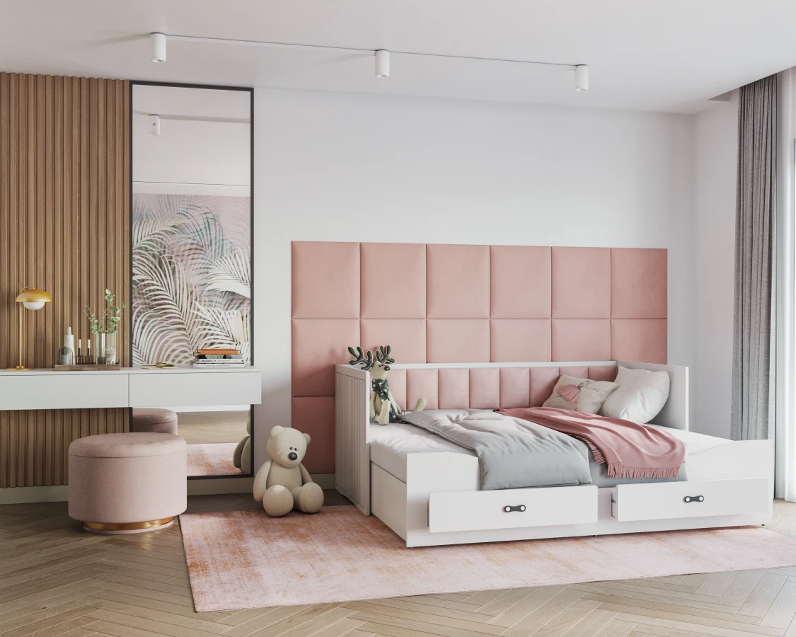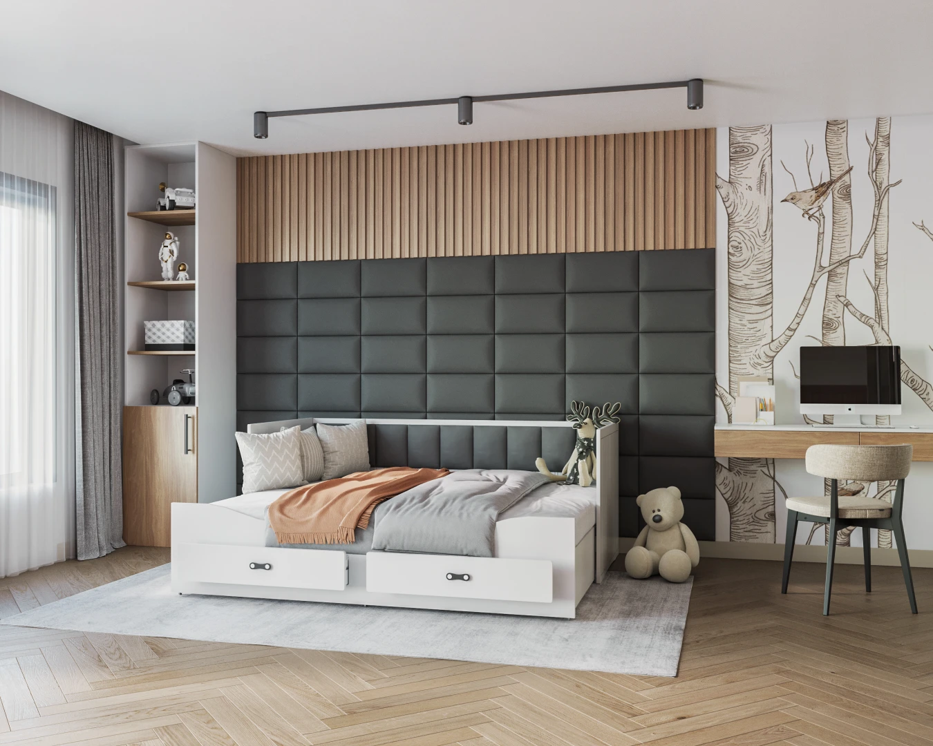 Das Polsterbett HARPER TRINITY ist die ideale Lösung für die sich schnell verändernden Bedürfnisse von Kindern und Jugendlichen und bietet sowohl Komfort als auch Funktionalität für den täglichen Gebrauch. Durch die Möglichkeit, es auszuklappen, kann dieses Möbelstück tagsüber als Einzelbett verwendet werden, das mehr Platz zum Spielen bietet, und lässt sich nachts leicht in ein Doppelbett verwandeln, das zusätzlichen Schlafplatz bietet. Die mitgelieferte Doppelschaummatratze sorgt für optimalen Halt und Schlafkomfort, und ihr Bezug lässt sich zum Waschen leicht abnehmen, so dass sie einfach sauber zu halten ist. Zusätzliche Schubladen auf Kufen unter dem Bett bieten einen praktischen Platz zum Verstauen von Bettzeug, Spielzeug oder Büchern, wodurch der verfügbare Platz erweitert und die Ordnung im Zimmer erleichtert wird. Die Ästhetik und Funktionalität des Bettes HARPER machen es zu einer Investition, die sowohl Eltern als auch ihren Kindern Freude bereiten wird, denn es bietet einen bequemen und stilvollen Schlafplatz für die nächsten Jahre.