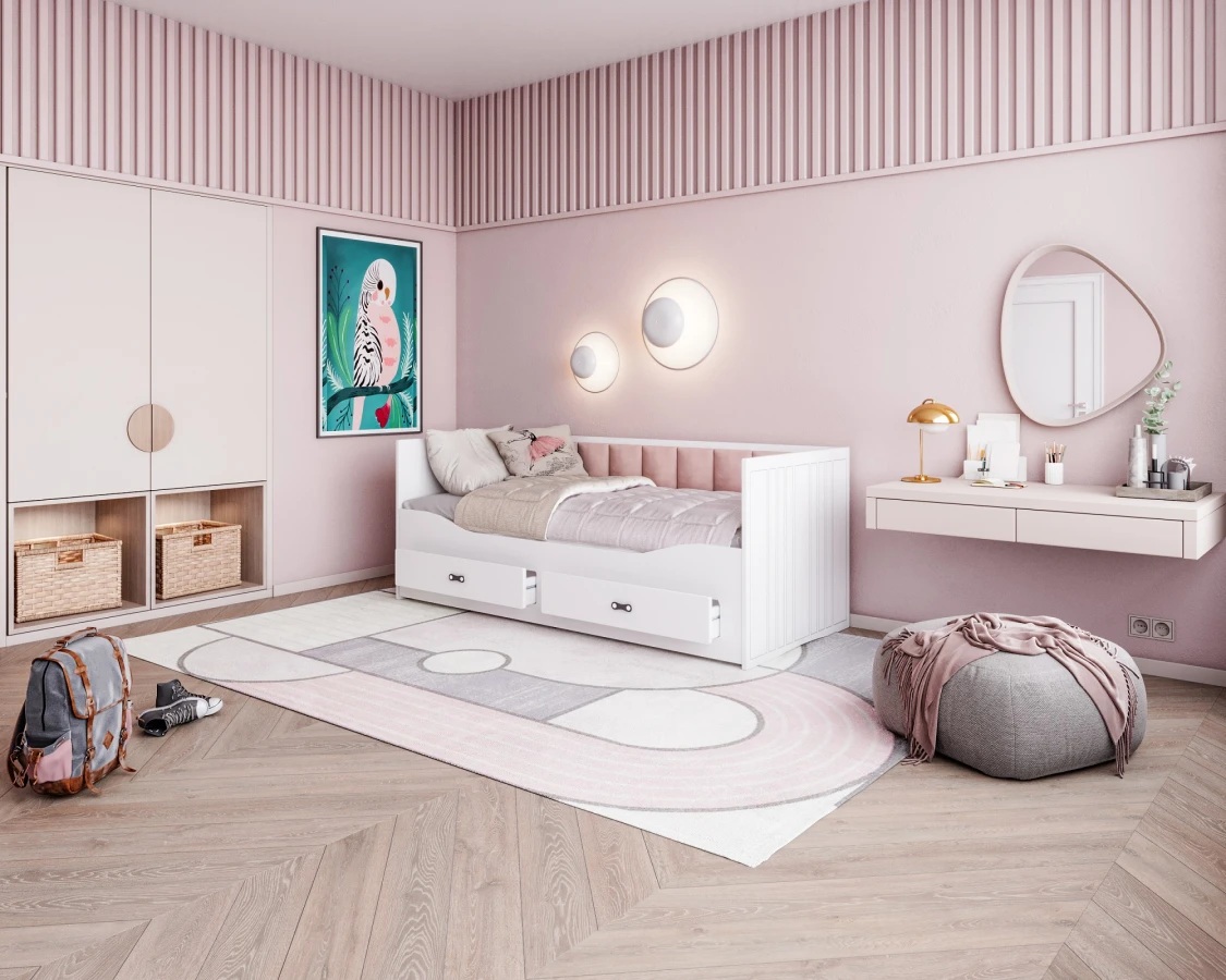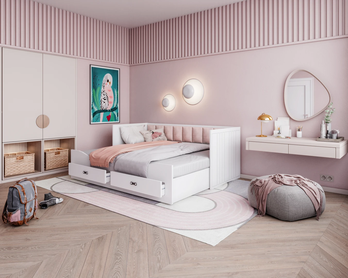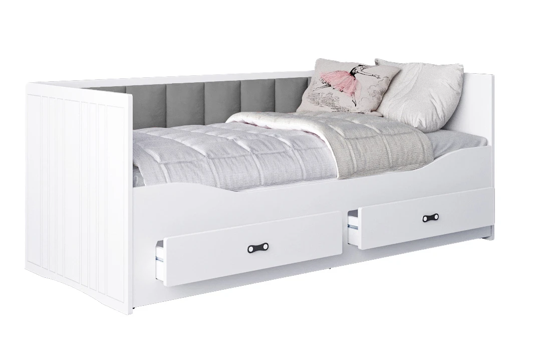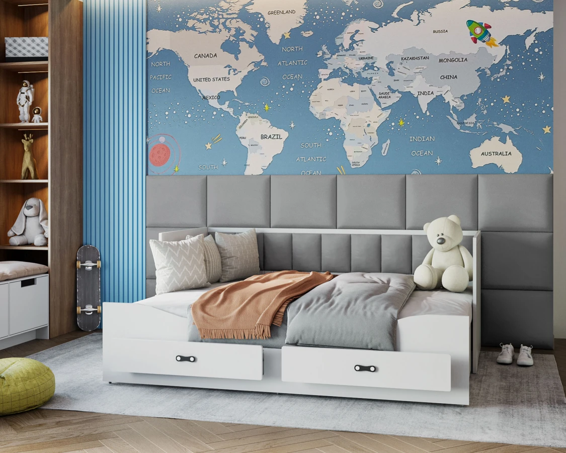 Das Polsterbett HARPER TRINITY ist die ideale Lösung für die sich schnell verändernden Bedürfnisse von Kindern und Jugendlichen und bietet sowohl Komfort als auch Funktionalität für den täglichen Gebrauch. Durch die Möglichkeit, es auszuklappen, kann dieses Möbelstück tagsüber als Einzelbett verwendet werden, das mehr Platz zum Spielen bietet, und lässt sich nachts leicht in ein Doppelbett verwandeln, das zusätzlichen Schlafplatz bietet. Die mitgelieferte Doppelschaummatratze sorgt für optimalen Halt und Schlafkomfort, und ihr Bezug lässt sich zum Waschen leicht abnehmen, so dass sie einfach sauber zu halten ist. Zusätzliche Schubladen auf Kufen unter dem Bett bieten einen praktischen Platz zum Verstauen von Bettzeug, Spielzeug oder Büchern, wodurch der verfügbare Platz erweitert und die Ordnung im Zimmer erleichtert wird. Die Ästhetik und Funktionalität des Bettes HARPER machen es zu einer Investition, die sowohl Eltern als auch ihren Kindern Freude bereiten wird, denn es bietet einen bequemen und stilvollen Schlafplatz für die nächsten Jahre.