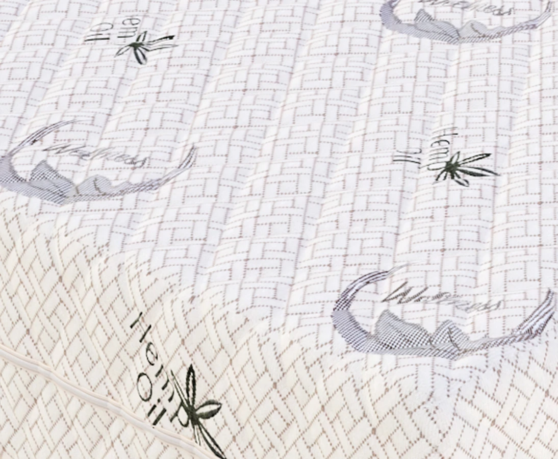 Der gesteppte Matratzenbezug HEMP bereichert den Schlaf durch den Zusatz von Hanföl, das für seine gesundheitsfördernden Eigenschaften bekannt ist. Das Öl ist speziell mit Hanfextrakt angereichert, der ein natürlicher Stressabbau ist und den Kampf gegen Schlaflosigkeit unterstützt. Die Mikrokapseln, die das Hanfkonzentrat enthalten, sind für das bloße Auge unsichtbar und werden während des Gebrauchs der Matratze nach und nach freigesetzt. Der HEMP-Zip-Matratzenbezug hat keinen spezifischen Hanfgeruch und das Öl beeinträchtigt weder seine Struktur noch seine Haltbarkeit.