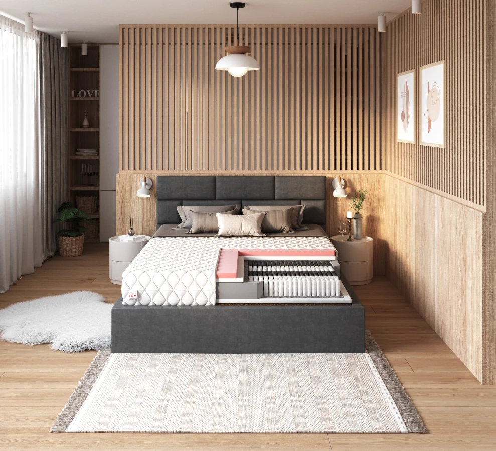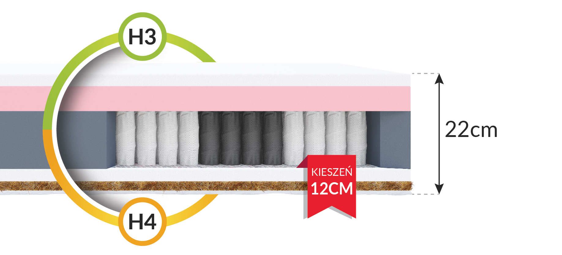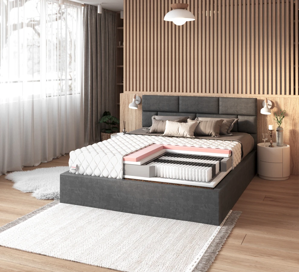 IVREA ist eine Matratze, die standardmäßig mehr bietet. Sie ist eine Art Hybridmatratze, d.h. sie besteht aus mehreren, unterschiedlichen Schichten. Die Basis, die auf Multipocket-Federn basiert, teilt sie in 7 Zonen der Körperunterstützung ein, so dass sich jeder Teil Ihres Körpers während des Schlafs wohl fühlt. Darüber hinaus wird dadurch sichergestellt, dass die Bewegungen der anderen Person weniger störend sind und ein ungestörter Schlaf gewährleistet ist. Die Federn sind mit der NanoHard-Technologie hergestellt, um eine lange Lebensdauer zu gewährleisten. Die zweite Schicht besteht aus einem haltbaren und elastischen Polyurethanschaum, der Ihren Körper gut abfedert. Ihr Körper passt sich perfekt an den Boden an, und Sie wachen morgens frisch und ausgeruht auf. Der thermoplastische VISCO-Schaumstoff hingegen bietet dank seines Formgedächtnisses unvergleichlichen Komfort und Bequemlichkeit, indem er Ihren Körper perfekt abbildet und später in seinen ursprünglichen Zustand zurückkehrt. Für zusätzliche Atmungsaktivität wird eine Kokosnussmatte verwendet, die als natürlicher Rohstoff die gesamte Struktur leicht verhärtet.