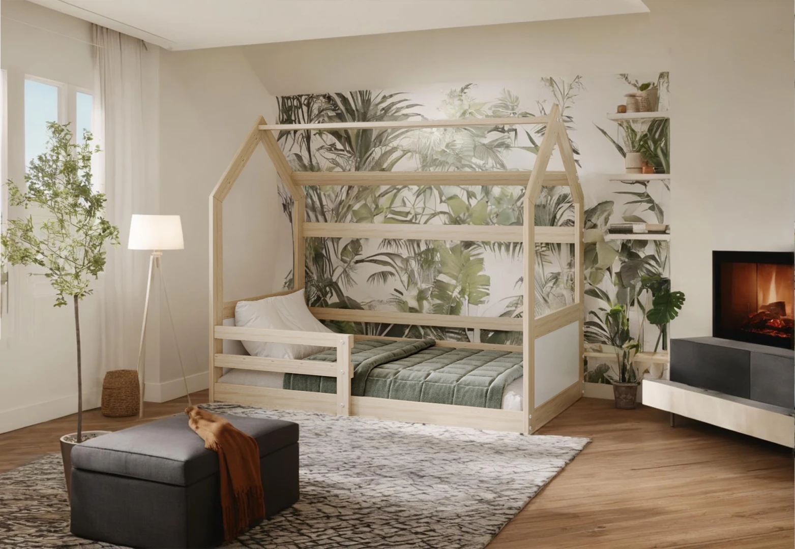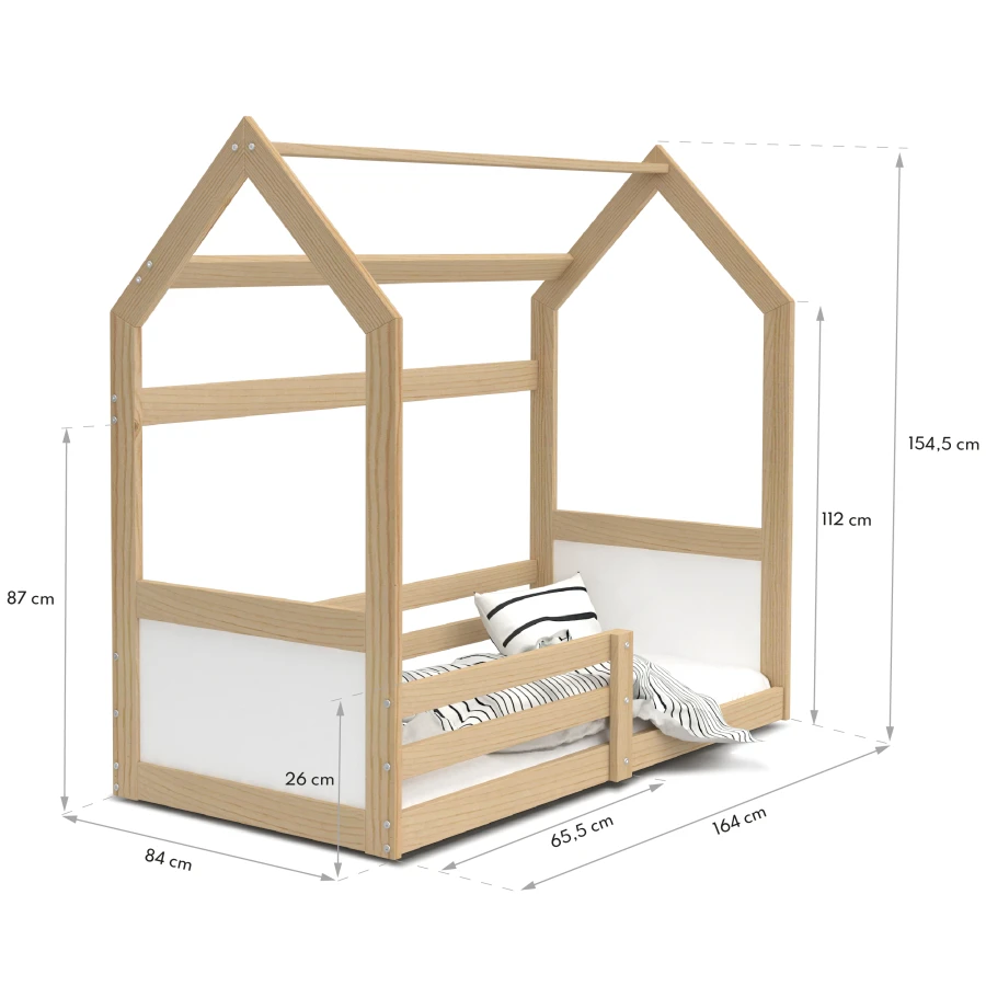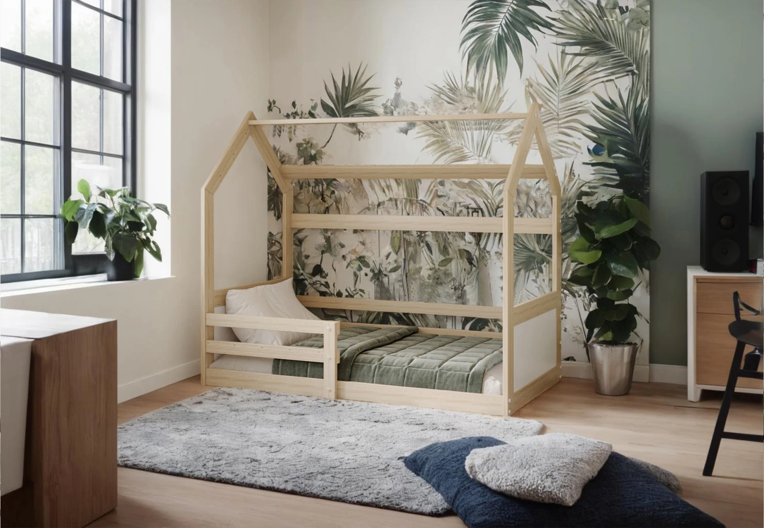 Das Hausbett aus Kiefernholz regt die Fantasie der Kinder beim Spielen an - umso mehr, als die Holzkonstruktion leicht nachrüstbar ist. Mit einer Decke oder einem Moskitonetz, das über den Rahmen gezogen wird, verwandelt sich ein gewöhnliches Bett in ein echtes Versteck" oder Basislager", in dem das Kind mit einem Freund spielen oder alleine Zeichentrickfilme schauen kann. An den Balken können mit Hilfe eines Elternteils schnell Dekorationen angebracht werden, z. B. Wattebällchen, die ein angenehmes Licht abgeben, oder Aufkleber mit einer beliebten Zeichentrickfigur. Wenn das Kind etwas größer ist, steht einem gemeinsamen Umstreichen des Bettes nichts im Wege, um eine neue "alte" Zimmereinrichtung zu schaffen. Das Sicherheitsgitter kann auf der linken oder rechten Seite des Bettes angebracht werden .