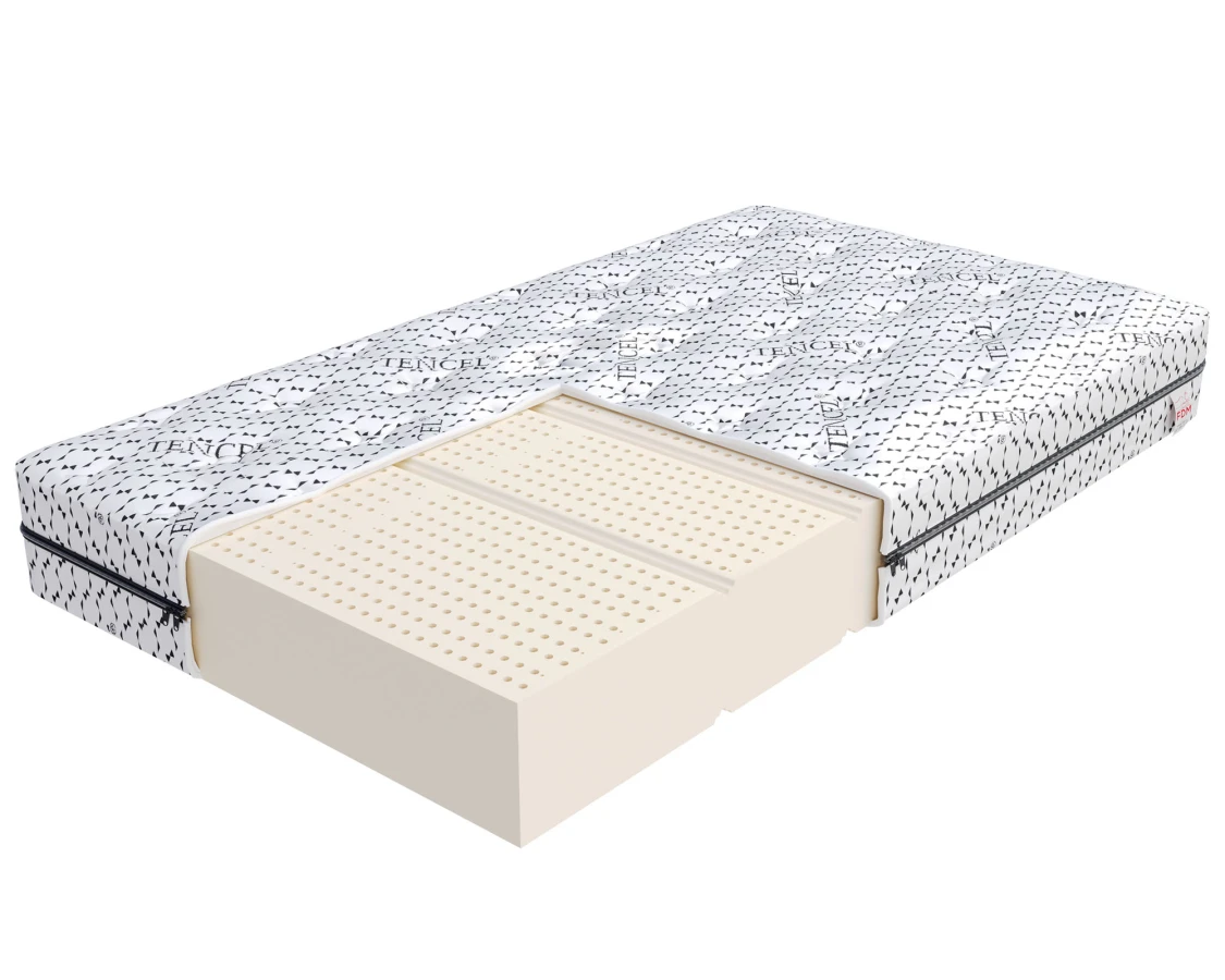 Die VALORE-Matratze verbindet elegante Schlichtheit mit höchster Verarbeitungsqualität. Ihr Herzstück ist ein Latexblock, eines der angesehensten Materialien in der Matratzenherstellung. Dank der Aufteilung in 7 Druckzonen passt sich die Matratze jedem Körperteil an, stützt die Wirbelsäule optimal und ermöglicht eine vollständige Erholung im Schlaf. Diese fortschrittliche Technologie macht jede Nacht zu einem Erlebnis von außergewöhnlichem Komfort. Nach jeder Nacht kehrt die Matratze schnell in ihre ursprüngliche Form zurück und beweist damit ihre außergewöhnliche Haltbarkeit und Verschleißfestigkeit. Die VALORE-Matratze bietet außerdem eine hervorragende Luftzirkulation. Die perforierte Latexstruktur begünstigt die natürliche Luftzirkulation und verhindert so eine Überhitzung der Matratze, insbesondere in heißen Nächten. Die antiallergenen Eigenschaften der Matratze wirken der Vermehrung von Mikroorganismen entgegen und machen sie zur idealen Wahl für Allergiker. VALORE ist mit einem speziellen TENCEL CARO-Bezug ausgestattet, der mit umweltfreundlichen LYOCEL Tencel-Fasern und Purotex®-Technologie angereichert ist.