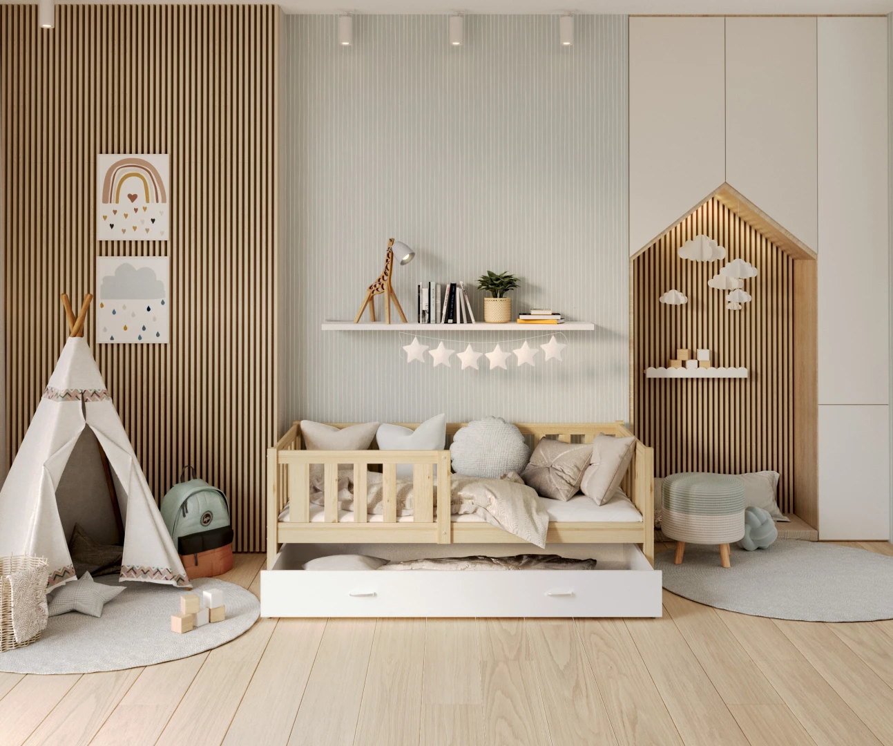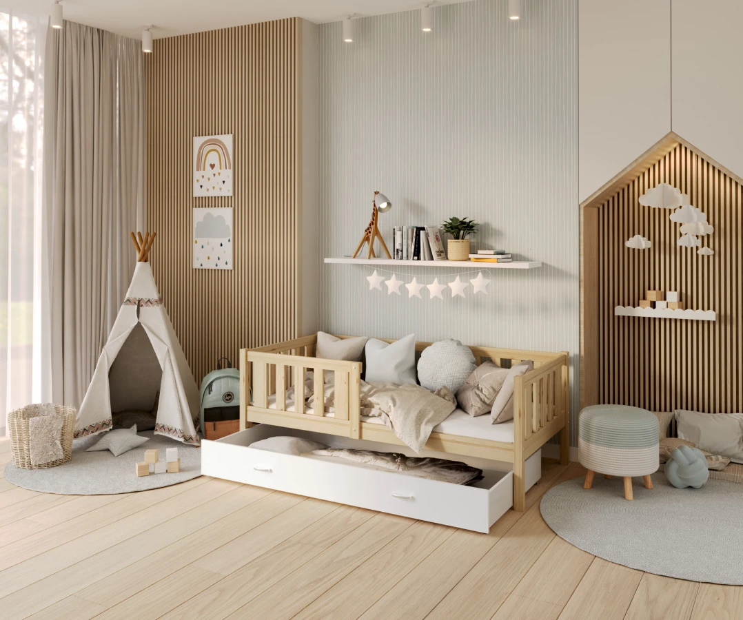 Das Kinderbett MARK ist die perfekte Ergänzung für jedes Kinderzimmer und zeichnet sich durch seinen skandinavischen Stil aus, der Schlichtheit und Eleganz vereint. Seine Funktionalität und Langlebigkeit machen es nicht nur zu einer ästhetischen, sondern auch zu einer praktischen Wahl. Die praktische Schublade unter dem Bett bietet wertvollen zusätzlichen Stauraum für Spielzeug, Bücher oder Bettzeug - ein unschätzbarer Vorteil in jedem Kinderzimmer. Darüber hinaus wurde das einstöckige Bett MARK mit Blick auf die Sicherheit und den Komfort der Kleinen entwickelt. Das niedrige Profil des Bettes erleichtert den Kindern das selbstständige Auf- und Absteigen und fördert so ihre Selbstständigkeit. Außerdem ist dieses Bett sehr einfach zu montieren, so dass das Zimmer schnell und mühelos umgestaltet werden kann.