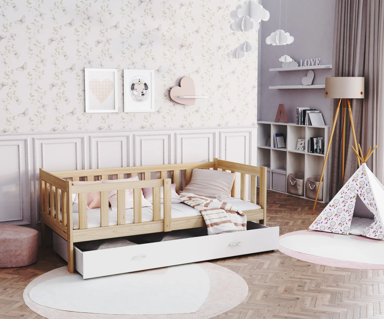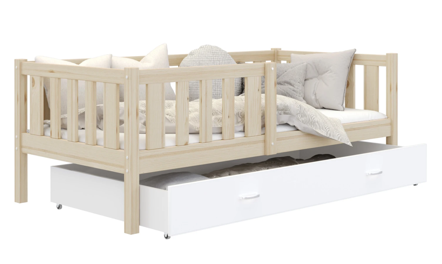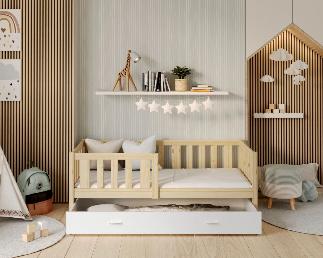 Die Farbe der Kiefer bringt Wärme und Natürlichkeit in das Kinderzimmer. Die hellen Farbtöne des Kiefernholzes erhellen nicht nur den Innenraum, sondern schaffen auch eine Atmosphäre der Ruhe und Harmonie, die für den Ruhebereich eines Kindes unerlässlich ist. Diese vielseitige Farbe lässt sich leicht mit einer Vielzahl von Einrichtungsstilen kombinieren, von modern bis klassisch, so dass das Bett perfekt zu anderen Einrichtungsgegenständen passt. Wenn Sie sich für das Bett MARK aus Kiefernholz entscheiden, investieren Sie nicht nur in Langlebigkeit und Sicherheit, sondern auch in ein ästhetisches und zeitloses Aussehen Ihres Kinderzimmers. Das Angebot gilt für das Bett selbst. Um eine Matratze in der passenden Größe zu kaufen, besuchen Sie bitte die Kategorie Kindermatratzen.