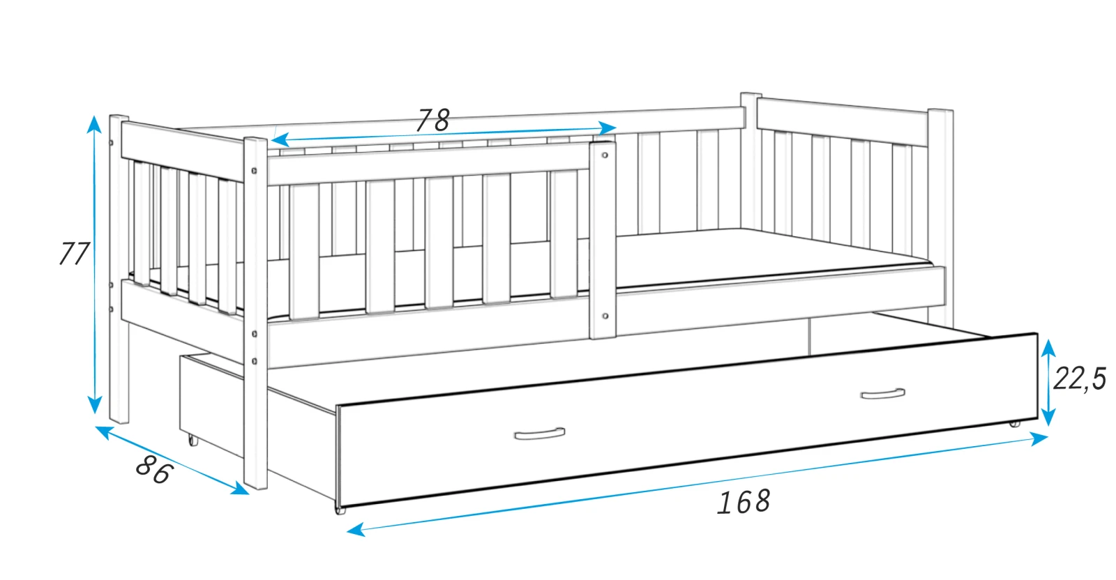 Das einstöckige Bett MARK ist die perfekte Ergänzung für jedes Kinderzimmer und zeichnet sich durch seinen skandinavischen Stil aus, der Schlichtheit und Eleganz verbindet. Seine Funktionalität und Haltbarkeit machen es nicht nur zu einer ästhetischen, sondern auch zu einer praktischen Wahl. Die praktische Schublade unter dem Bett bietet wertvollen zusätzlichen Stauraum für Spielzeug, Bücher oder Bettzeug, was in jedem Kinderzimmer von unschätzbarem Wert ist. Wir empfehlen Ihnen, sich für das Kinderbett MARK zu entscheiden, das nicht nur schön anzusehen, sondern auch robust und funktional ist. Es ist eine Investition, die Ihrem Kind einen bequemen und sicheren Schlafplatz bietet und gleichzeitig eine stilvolle Ergänzung des Interieurs ist, die den Test der Zeit bestehen wird. Wenn Sie sich für das MARK Bett entscheiden, entscheiden Sie sich für eine Kombination aus Ästhetik, Funktionalität und Langlebigkeit, die es zur perfekten Wahl für alle Eltern macht.