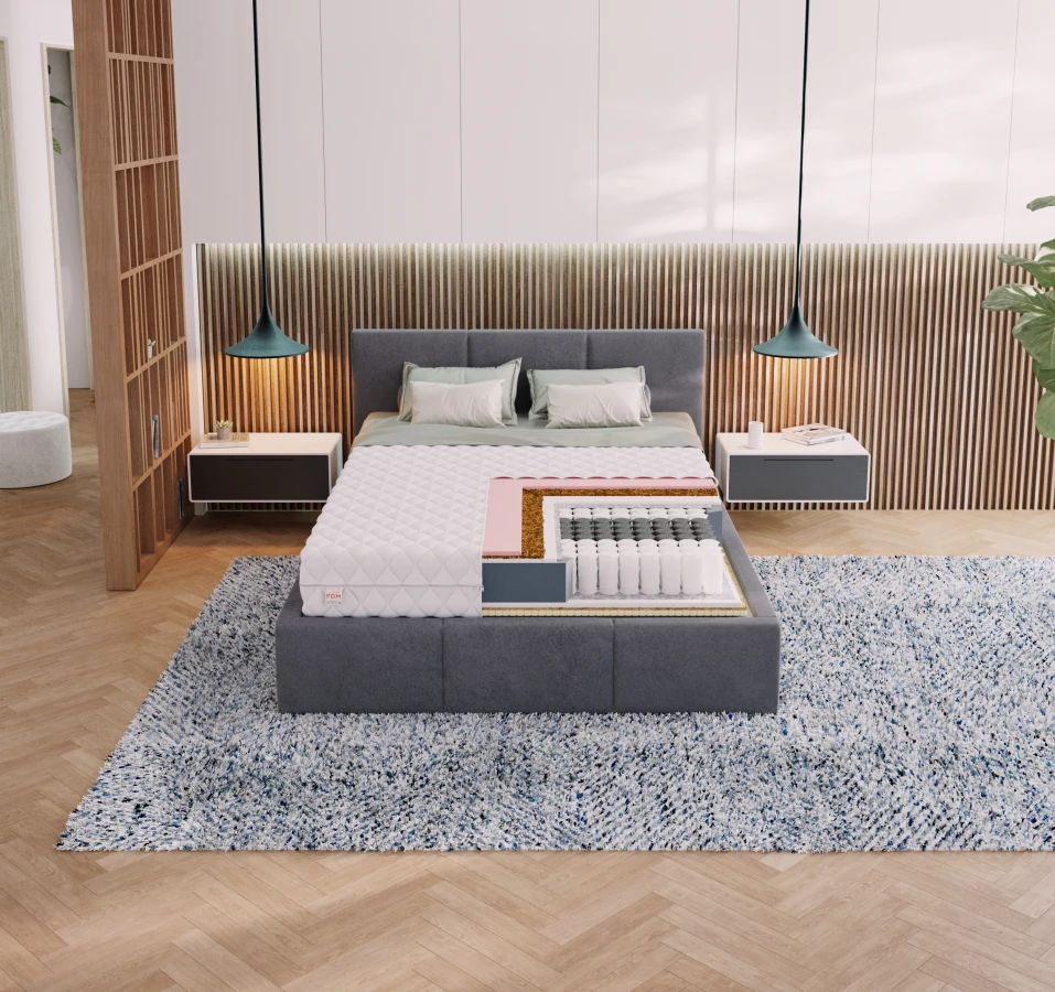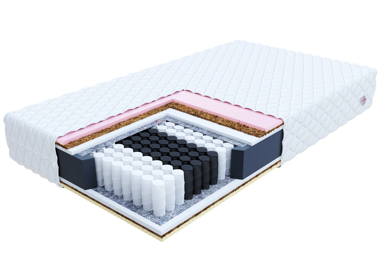 Auf beiden Seiten wird eine Schicht aus Kokosnuss verwendet, die die gesamte Oberfläche versteift und eine gute Luftzirkulation gewährleistet. Auf einer Seite wird VISCO-Thermoplastschaum verwendet, der sich unter dem Einfluss von Temperatur und Körpergewicht an die Körperform des Benutzers anpasst. Dadurch erhält die Wirbelsäule eine natürliche Haltung und Unterstützung. Auf der anderen Seite wird eine Latexeinlage verwendet, die sich durch hohe Elastizität und hervorragende Luftdurchlässigkeit auszeichnet. Sie verformt sich nicht dauerhaft und behält ihre ursprüngliche Form bei und ist auch für Allergiker bequem und sicher.