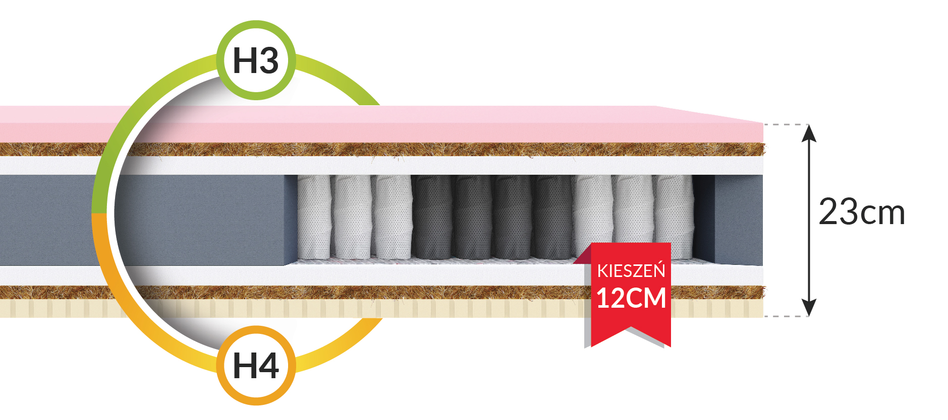 Das Modell NARNI gehört zur Familie der Taschenmatratzen. Die Taschenfedern sind mit der NanoHARD-Technologie hergestellt, der doppelt gehärtete Draht verlängert ihre Lebensdauer erheblich. Dank der Verwendung von 7 Zonen mit unterschiedlichem Härtegrad bietet die Matratze eine ergonomische Körperposition während der Ruhezeit. Die unabhängige Arbeit der Federn eliminiert den Effekt, dass sich die große Oberfläche der Matratze verbiegt, wenn Druck auf ihre kleine Oberfläche ausgeübt wird. Dadurch wird jede Art von Drehen oder Bohren für die andere Person nicht spürbar. Die Tascheneinlage ist von T25-Polyurethanschaum umgeben, der verformungsbeständig und sehr langlebig ist.