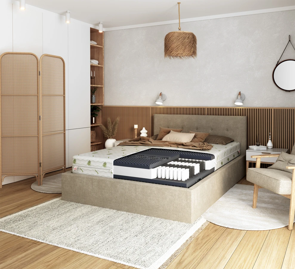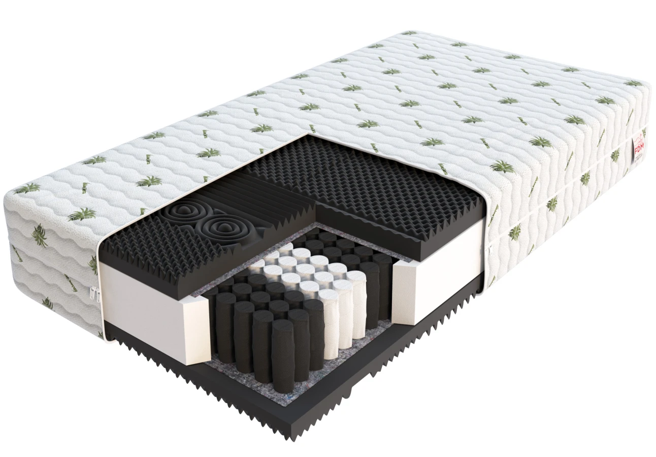 Die Matratze verwendet zusätzlich moderne Schaumstoffe. Einer davon ist der hochflexible HR-Schaum, der sich unter dem Druck des Schlafenden perfekt an seinen Körper anpasst und später wieder in seine ursprüngliche Form zurückkehrt. Auf der anderen Seite der Matratze befindet sich ein Schaumstoff mit unregelmäßiger Struktur, der sich unter dem Druck des Körpers leicht zurückzieht. Der Schaum massiert passiv die Muskeln und die Haut des Schlafenden. Für Menschen, die lange im Bett liegen, beugt er Druckstellen vor, und für gesunde Menschen entspannt er auf angenehme Weise verspannte Muskeln und macht das Schlafen auf der Matratze noch angenehmer.