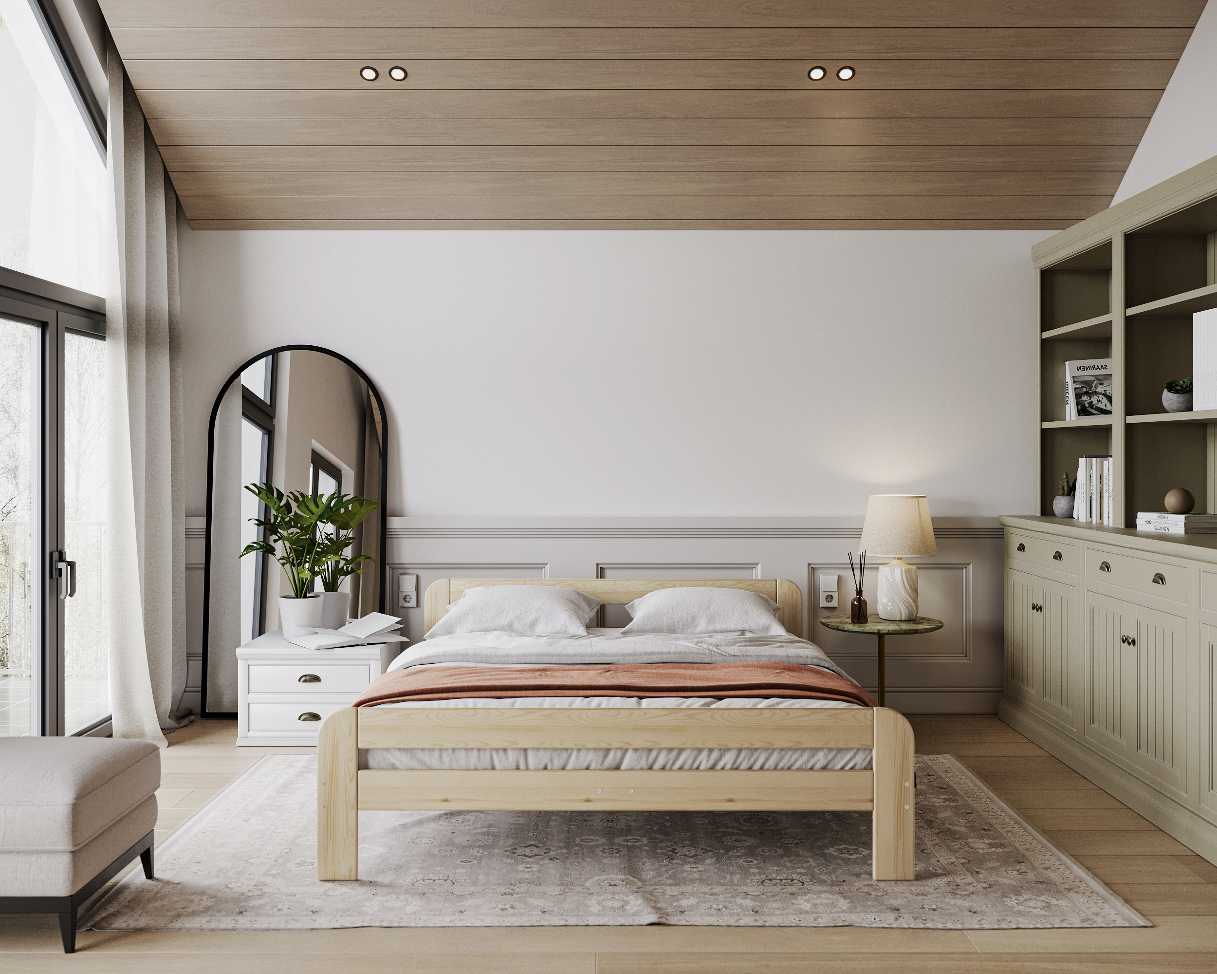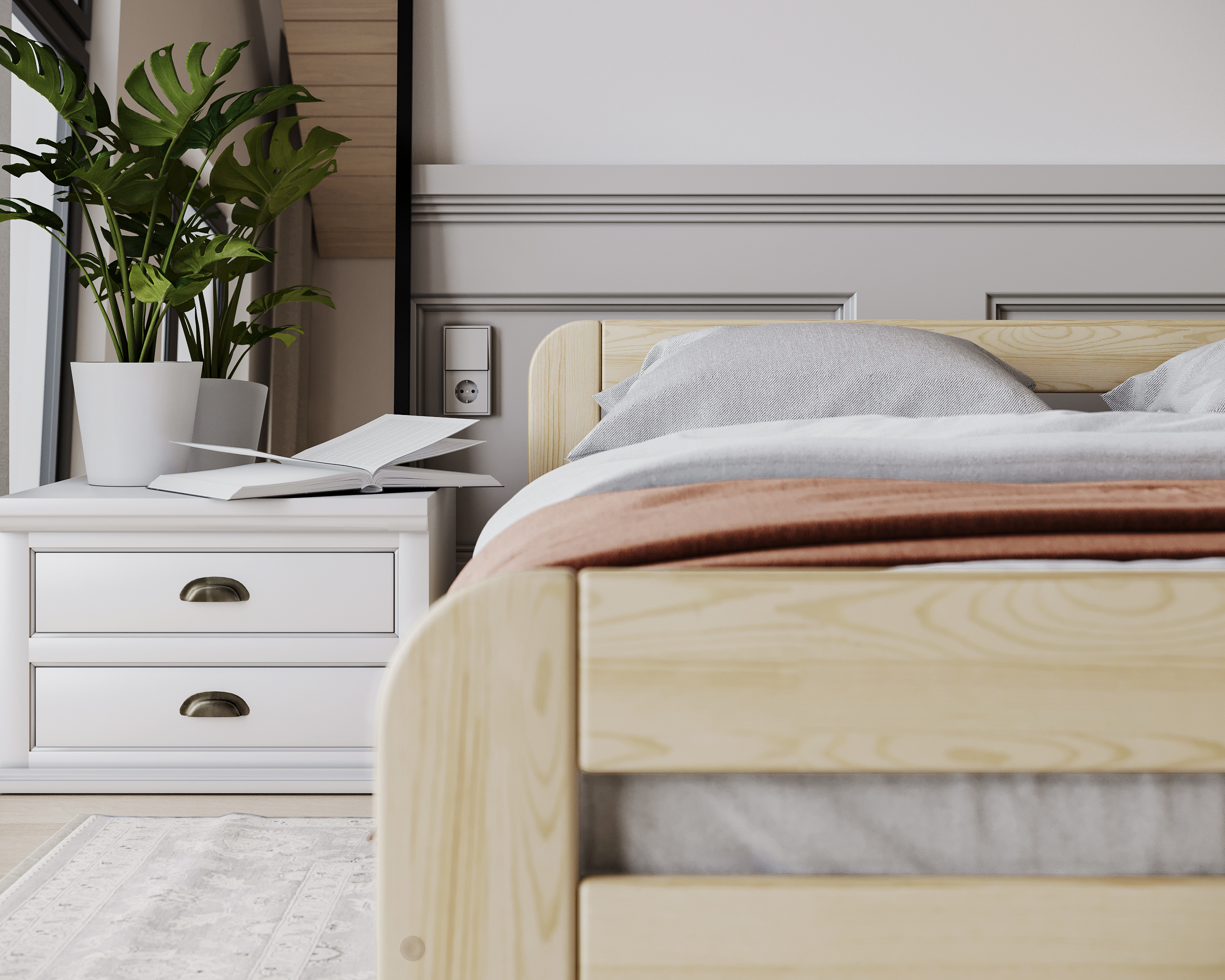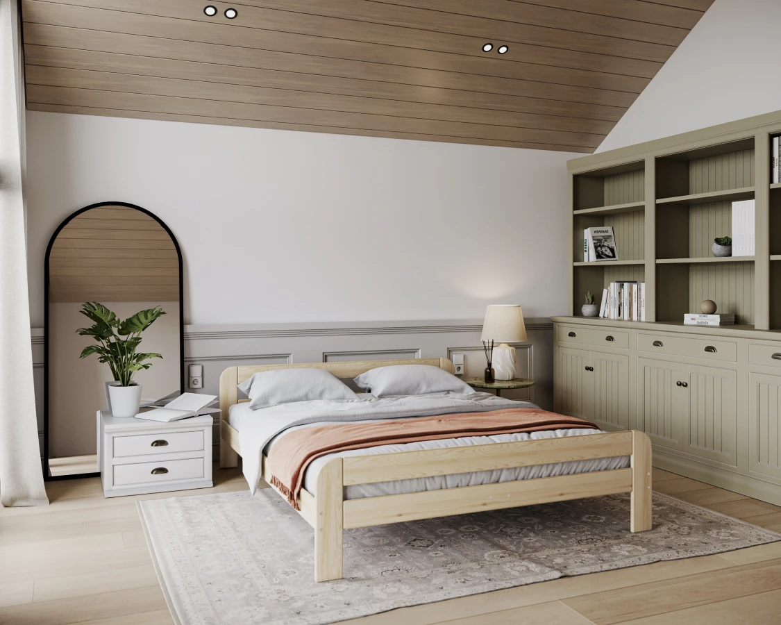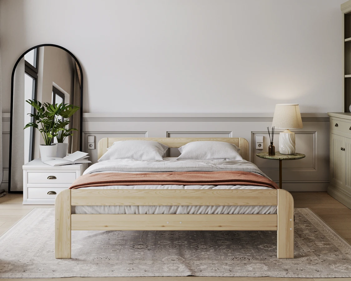 Das Bett OREGON ist aus polnischem Kiefernholz gefertigt, das nicht nur ein ästhetisches Aussehen, sondern auch eine jahrelange Haltbarkeit gewährleistet. Holz ist ein natürliches Material, dessen größter Vorteil seine Einzigartigkeit ist. Aus diesem Grund ist es schwierig, zwei identische Stücke zu erhalten, weshalb die Anzahl der Äste und die Farbe des Holzes leicht von den Darstellungen auf der Visualisierung abweichen können. Das Bettmodell OREGON ist die Quintessenz des skandinavischen Stils und verbindet minimalistischen Charme mit hoher Funktionalität. Seine schlichten Linien, die Verwendung natürlicher Materialien und die subtilen Details machen es zu einer perfekten Wahl für alle, die sowohl Ästhetik als auch praktische Lösungen für ihr Schlafzimmer schätzen.