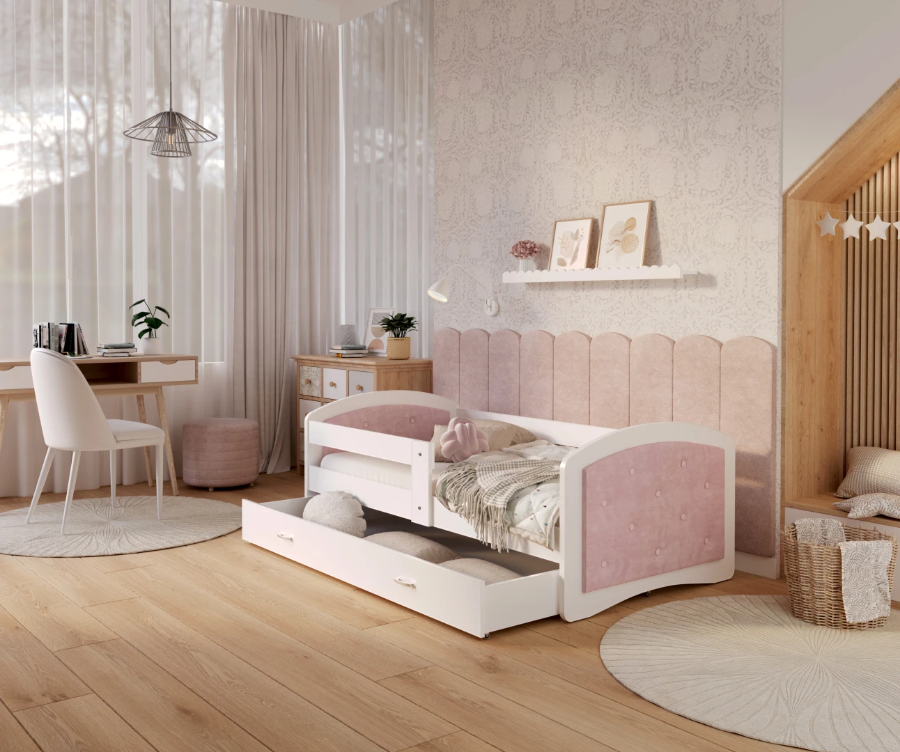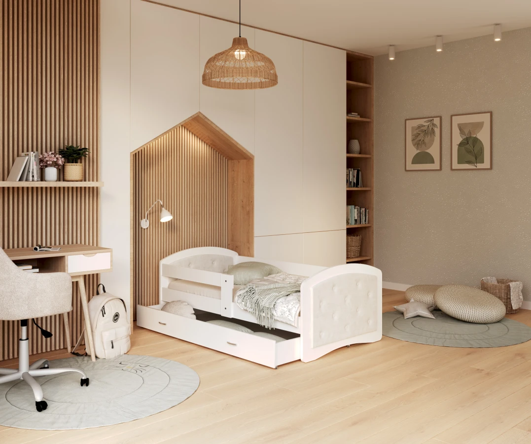 Erfreuen Sie Ihr Kind mit einem gepolsterten Bett, das in speziell für Sie ausgewählten Farben erhältlich ist. Ob ein zartes Puderrosa, ein tiefes Weiß oder vielleicht ein stilvolles Grau - wählen Sie den Farbton, der am besten zu Ihren Vorlieben passt. Unser Sortiment umfasst eine große Auswahl an Farben, die sowohl den Geschmack der Eltern als auch den ihrer Kinder und sogar den der wählerischsten Teenager treffen. Mit Polstermöbeln, die sich den wachsenden Bedürfnissen der Kinder anpassen, sichern Sie sich Langlebigkeit und Stil für die nächsten Jahre. Wir verwenden für die Herstellung ein abriebfestes Material, so dass ein gepolstertes Kinderbett sowohl für das kleine Vorschulkind als auch für den heranwachsenden Teenager ideal ist.