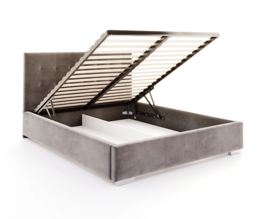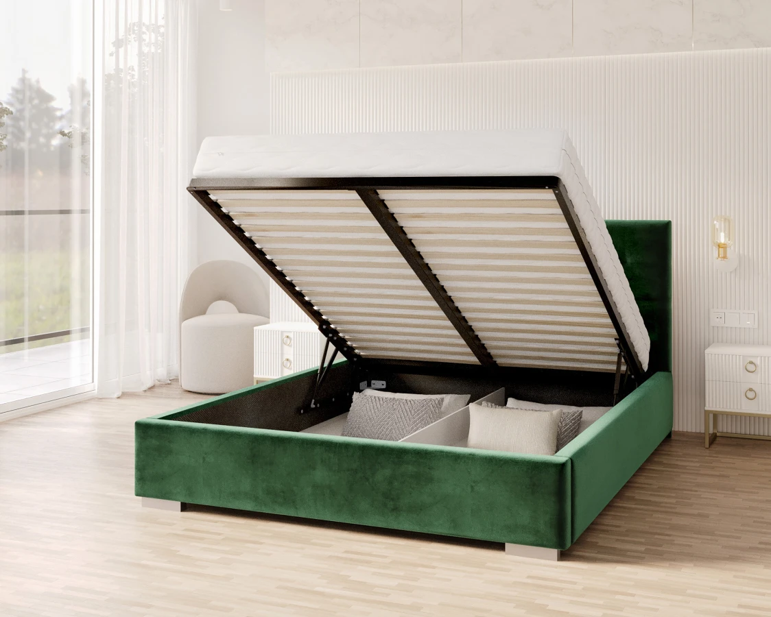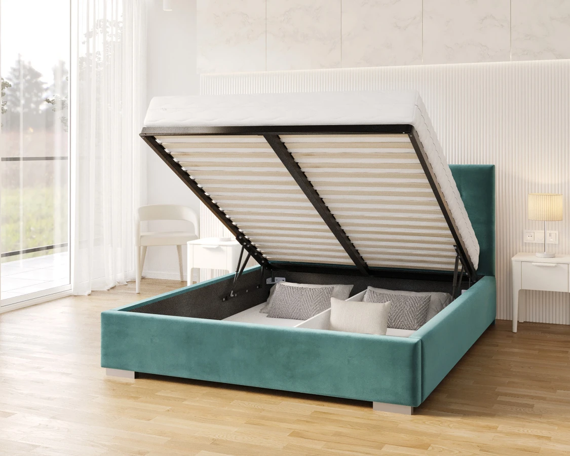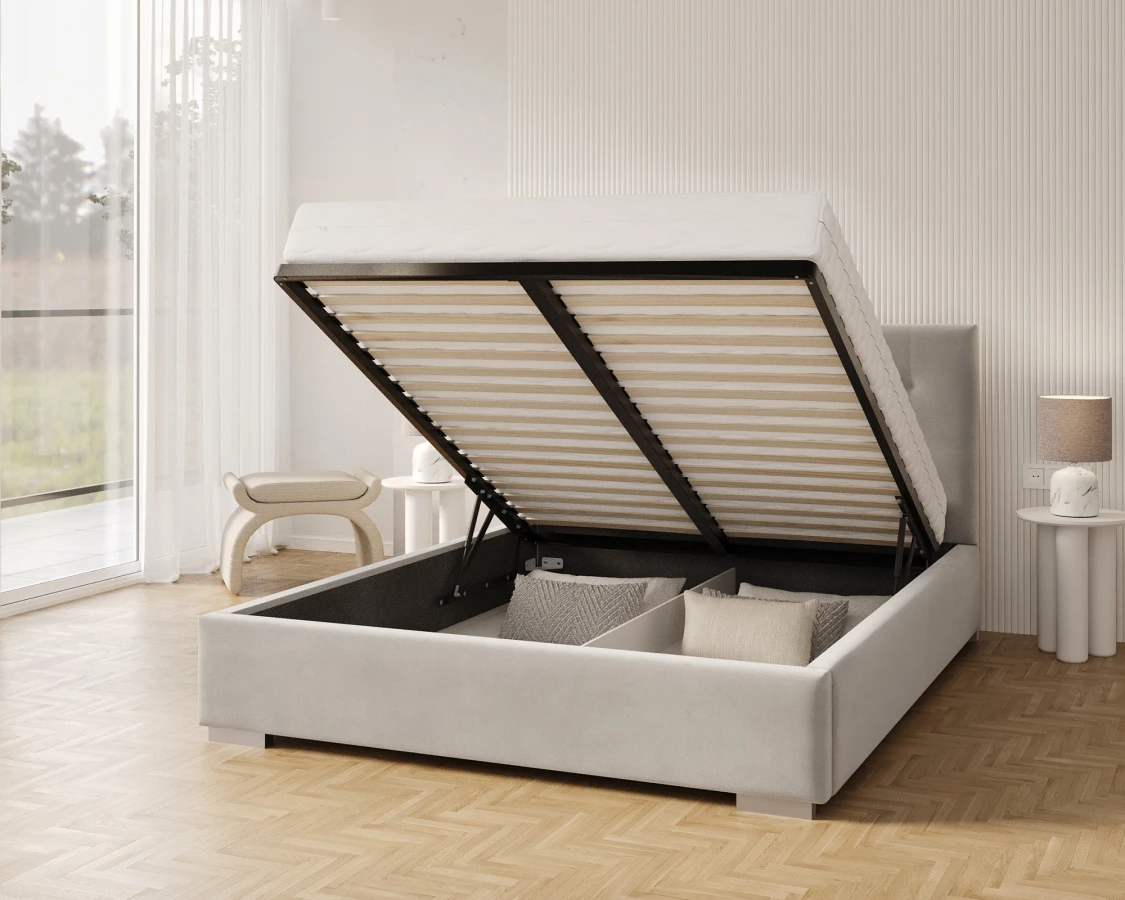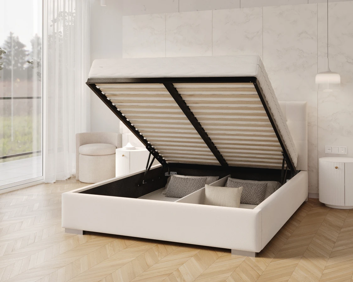 Jedes Bett sollte nicht nur bequem, sondern auch nützlich sein. Deshalb wurde beim Modell LUCERNA durch den Einsatz eines Hubrahmens die Möglichkeit geschaffen, einen tiefen Bettzeugbehälter unterzubringen und leicht zugänglich zu machen. So entsteht zusätzlicher Raum, der als Stauraum genutzt werden kann. Dank der verwendeten Unterteilung ist es einfach, Ordnung zu halten. So ist das Bett LUCERNA nicht nur ein bequemer Schlafplatz, sondern auch ein praktisches und geräumiges Möbelstück.