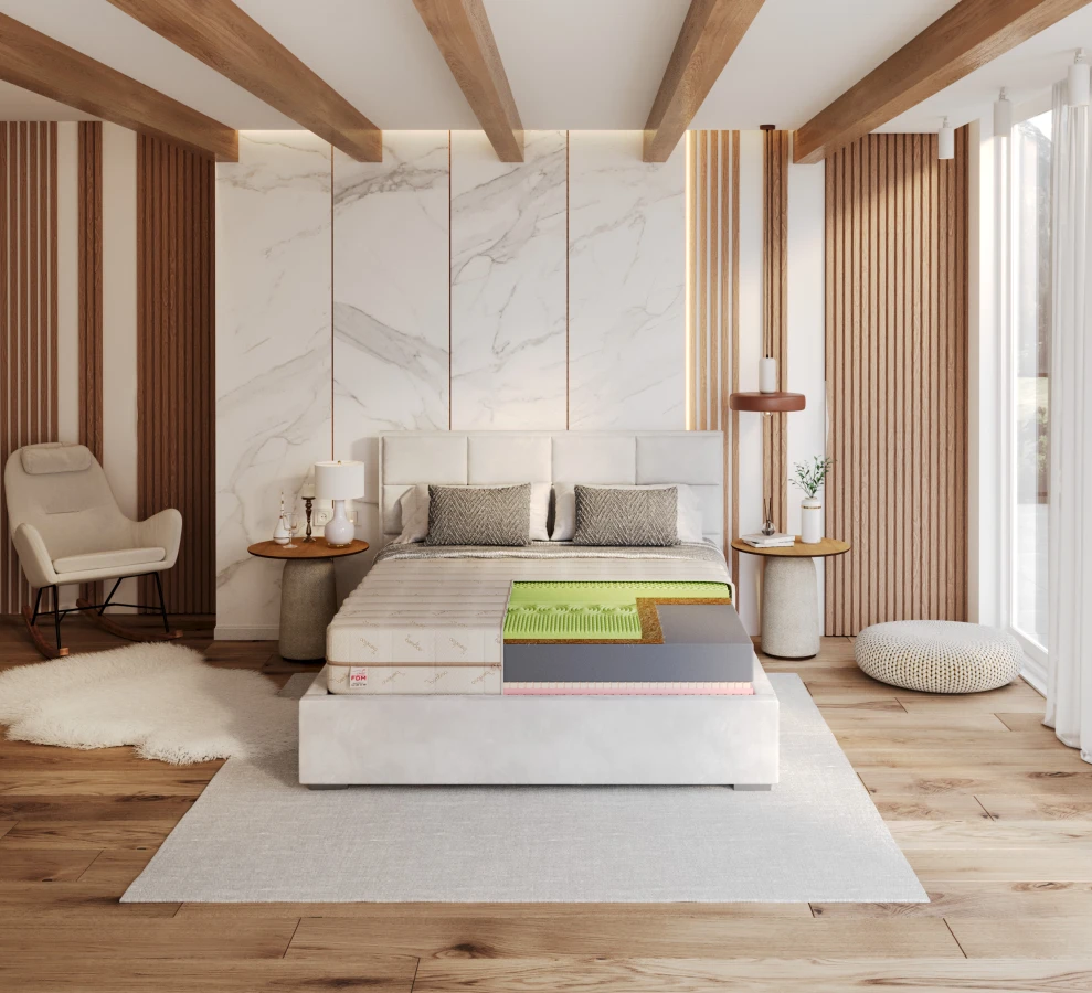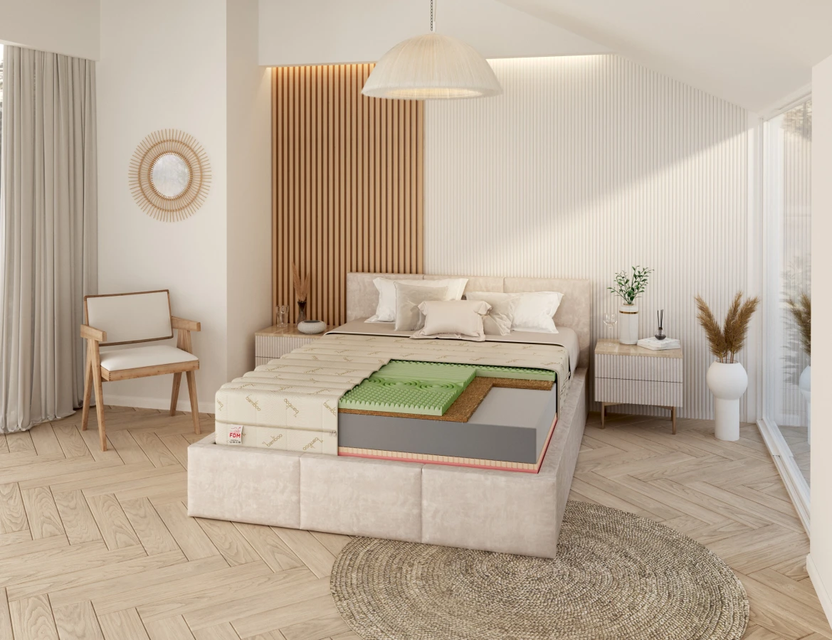 Die RELAX-Matratze wurde mit Blick auf die Bedürfnisse auch der anspruchsvollsten Kunden entwickelt. Der Hauptkern der Matratze besteht aus T25-Polyurethanschaum, der dank seiner erhöhten Haltbarkeit viele Jahre lang verwendet werden kann. Um einen angemessenen Komfort zu gewährleisten, wurde eine Seite der Matratze aus hochelastischem 7-Zonen-HR-Schaum und einer Kokosmatte hergestellt, die die Oberfläche versteift. Diese Kombination ergibt eine festere Seite, die sich perfekt an den Körper anpasst und empfindliche Stellen entspannt. Die andere Seite hingegen ist mit einer Latexschicht und einem profilierten VISCO-Thermoplastschaum ausgestattet, der eine Formgedächtnisfunktion hat. Die Kombination dieser beiden Elemente macht jede Nacht zu einer erholsamen Nacht und sorgt für eine angemessene Erholung.