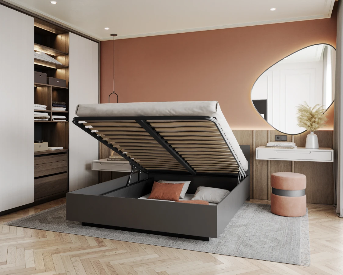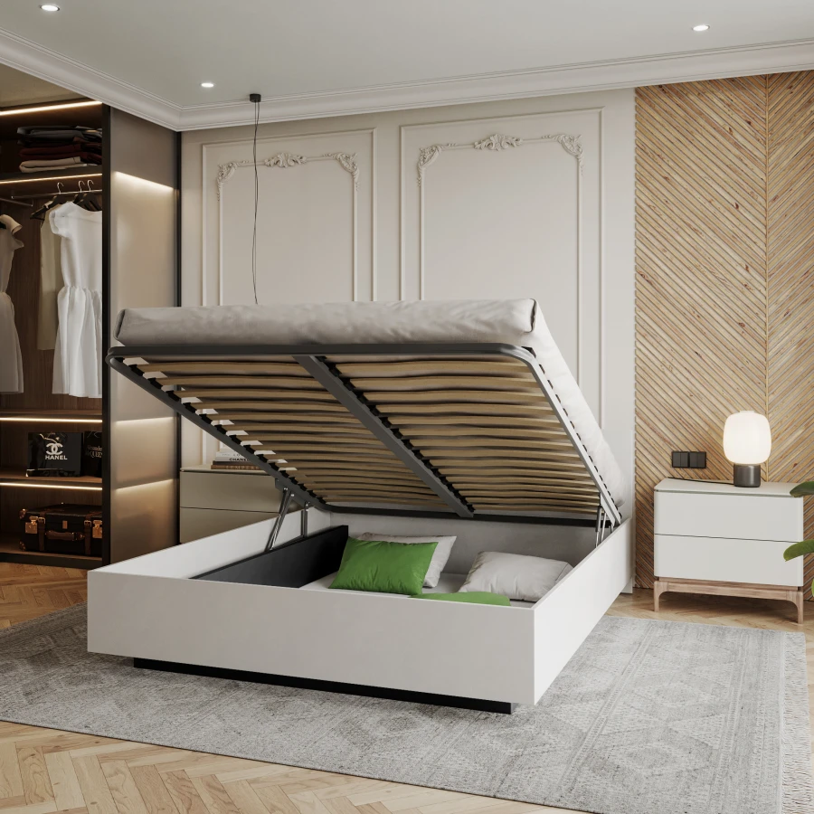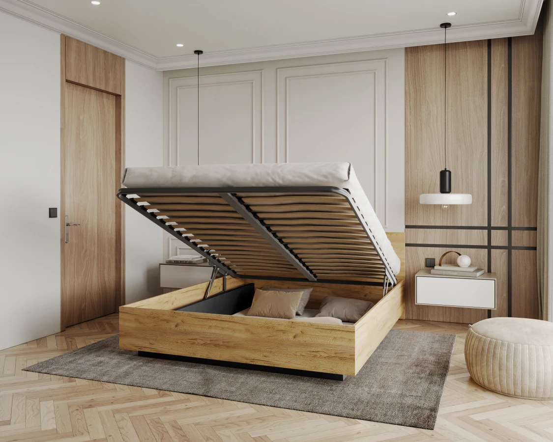 Ein Schlafzimmerbett sollte neben seiner Grundfunktion auch nützlich sein. Deshalb ist das Modell LIMA mit einem großen Behälter für Bettzeug oder andere Dinge ausgestattet, die nicht in den Kleiderschrank passen. Er ist sehr geräumig, und da er nahe am Boden steht, können schwere Gegenstände hineingestellt werden, ohne dass die Gefahr besteht, dass der Boden des Stauraums zusammenbricht. Durch den anhebbaren Matratzenrahmen ist ein leichter Zugang gewährleistet. Er arbeitet mit Gasflaschen, so dass zum Anheben nur wenig Kraft erforderlich ist. Der Rahmen ist aus Metall, während die Federleisten aus Birkenholz bestehen und in Kunststoffhaltern gelagert sind.