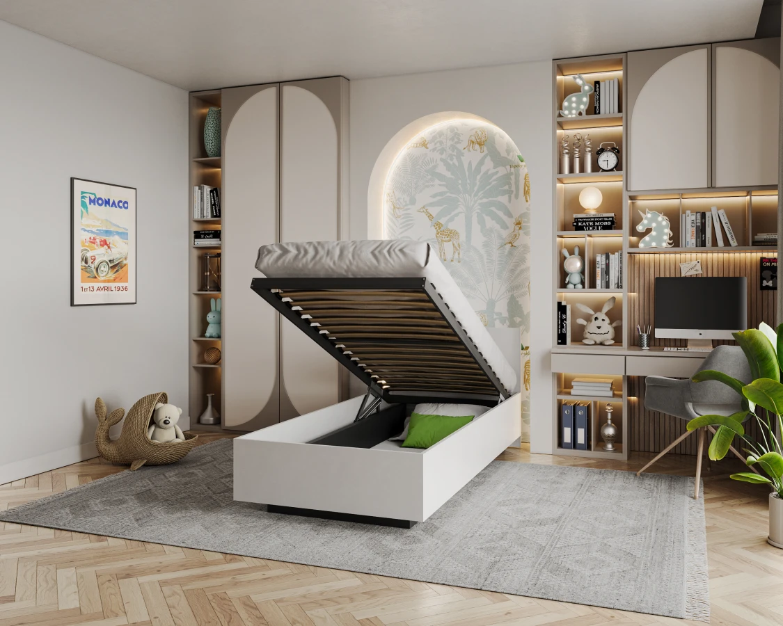 Das Einzelbett LIMA ist ein robustes und solides Möbelstück im skandinavischen Stil. Es hat einen erhöhten Metallrahmen mit gefederten Birkenlatten. Jede Latte ist in einer Kunststofftasche untergebracht, die ein Knarren des Bettes verhindert. Der Rahmen wird von einem Hebemechanismus mit Gaszylindern getragen.