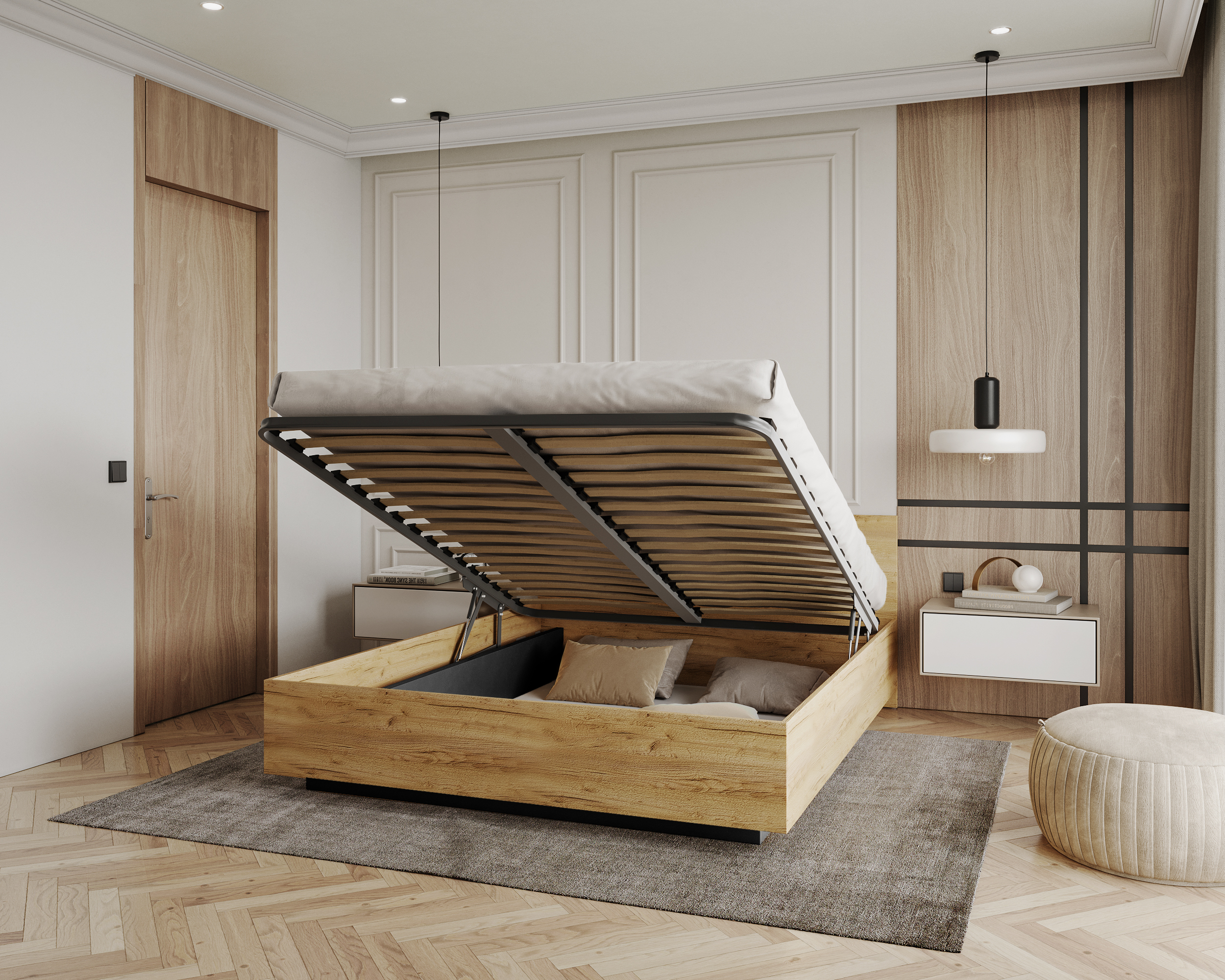 Das LIMA-Schwebebett ist eine innovative Konstruktion mit einem Rahmen, der so gestaltet ist, dass er in der Luft zu schweben scheint und die Illusion erweckt, keinen Kontakt zum Boden zu haben. Die Designer haben dafür gesorgt, dass der Schwerpunkt ausreichend stabil ist, so dass selbst eine Person, die auf der Kante sitzt, dieses Gleichgewicht nicht stören kann. Die zentrale Stütze des Bettes bietet mehr Platz für die Füße und einen freien Zugang von beiden Seiten. Darüber hinaus bringt dieses Design ein modernes Element in den Innenraum und verleiht dem Zimmer Leichtigkeit und Originalität. Das Design überwältigt den Innenraum nicht und eignet sich daher perfekt für kleine Schlafzimmer. Die Anhebung vom Boden erleichtert nicht nur die Reinigung und verbessert die Luftzirkulation, sondern verleiht dem gesamten Raum auch Eleganz. Merkmale: mehr Fußraum, komfortable Bettwäsche, ausgeprägter Schwebeeffekt. Das schwebende Bett ist eine funktionelle und stilvolle Lösung, die einen futuristischen Designeffekt erzeugt.