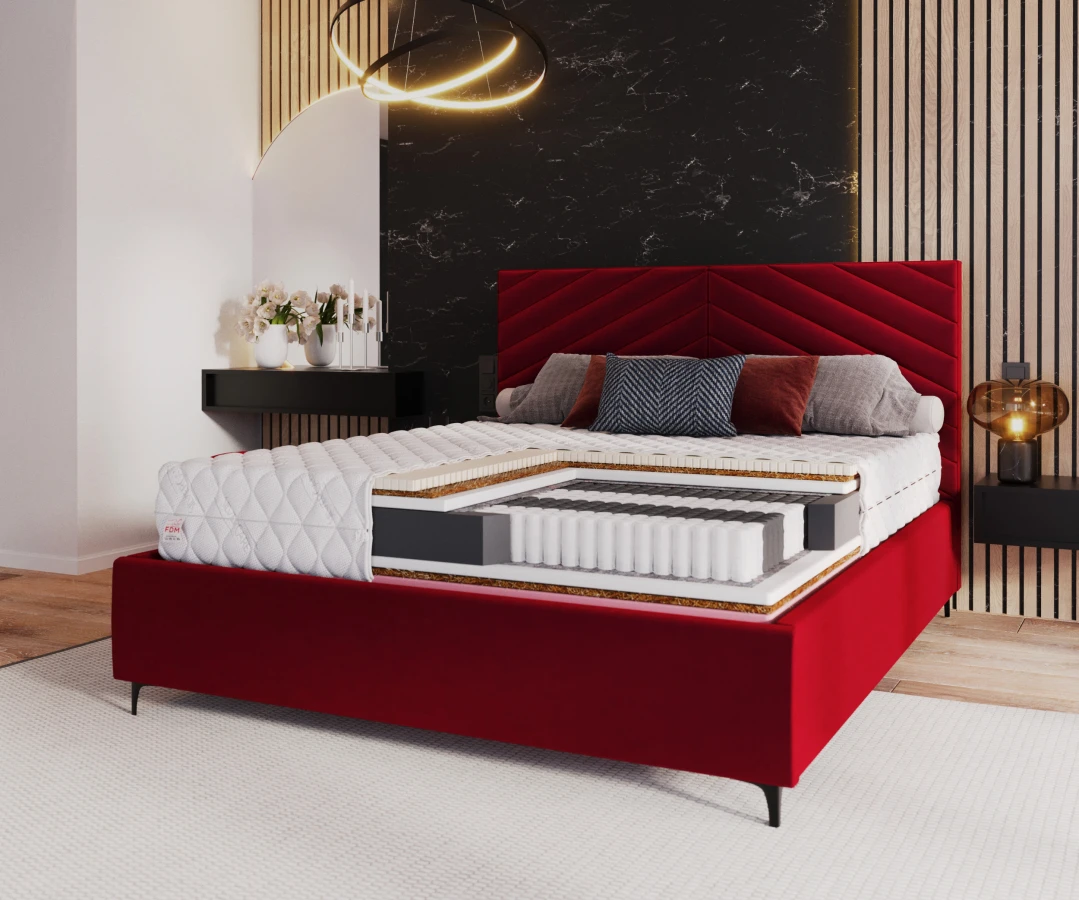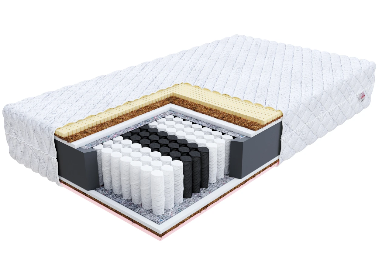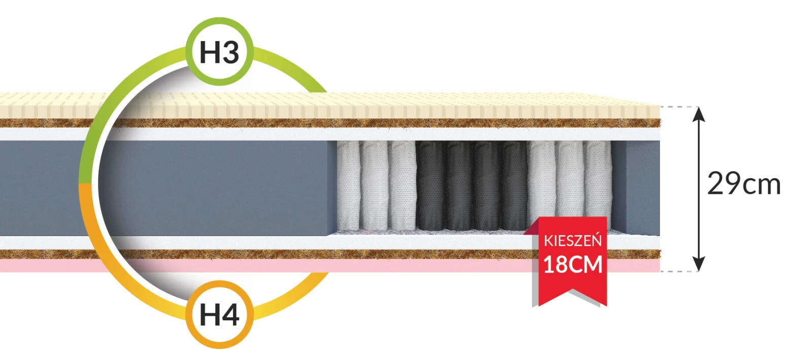 Der Schlafkomfort auf der Matratze wird durch die bei ihrer Herstellung verwendeten Schaumstoffe erheblich gesteigert. Der Polyurethanschaum verbessert die Federung der Matratze, und der thermoplastische VISCO-Schaum passt sich unter dem Einfluss der Körpertemperatur sanft an den Körper an (um später wieder in seine ursprüngliche Form zurückzukehren). Er verleiht dem Produkt orthopädische und dekubitushemmende Eigenschaften. Doch damit sind die Vorteile noch nicht erschöpft. Bei der Herstellung der Matratze werden auch Latex- und Kokosnusseinlagen verwendet. Beide Materialien sind für ihre starken antiallergischen Eigenschaften bekannt. Die Perforationen im Latex lassen die Matratze "atmen", was die Hygiene bei der Benutzung verbessert, und die natürlichen Kokosfasern verhärten die Matratze auf einer Seite (der Besitzer kann die Matratze auf eine weichere oder festere Seite verlegen, wenn er sie wechseln möchte).