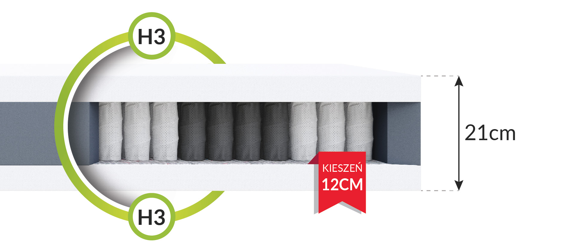 Aber das ist noch nicht alles. Die Aria-Taschenmatratze ist in 7 Härtezonen eingeteilt, in denen die Arbeit der Federn noch genauer auf die Druckkraft der einzelnen Körperteile abgestimmt ist (der Druck der Schultern oder der Hüften auf die Matratze ist stärker als z. B. der Druck des Kopfes oder der Lendengegend). Dadurch entlastet die Matratze Muskeln und Gelenke während des Schlafs einwandfrei, so dass sie sich entspannen und erholen können. Ein weiteres Merkmal der Matratze ist, dass auf beiden Seiten der Matratze Schichten aus Polyurethanschaum angebracht sind. Der Schaumstoff gibt unter dem Druck des Körpers des Liegenden sanft nach und sorgt so für einen noch besseren Schlafkomfort, kehrt dann aber wieder in seine ursprüngliche Form zurück. Dank ihm verformt sich die Matratze nicht und behält eine gleichmäßige Oberfläche. Der Schaum sorgt außerdem dafür, dass die Matratze auf beiden Seiten einen Härtegrad von H3 erreicht.