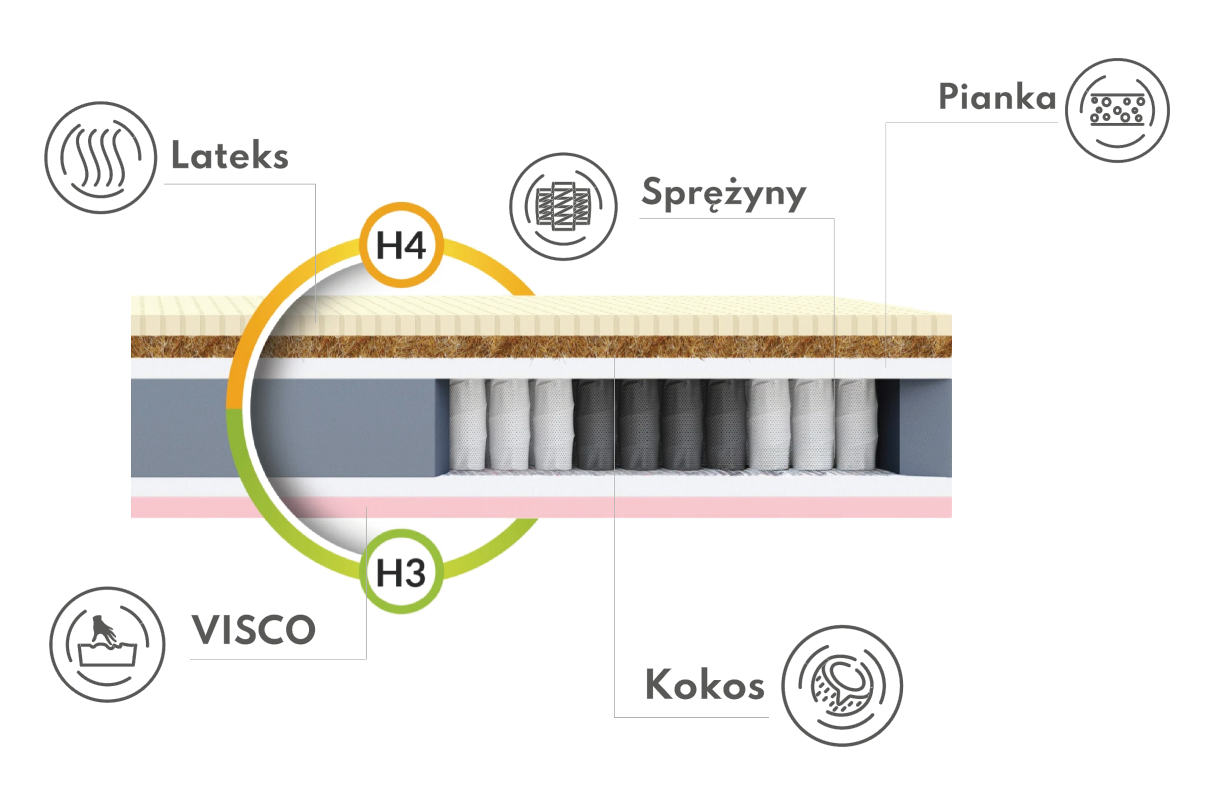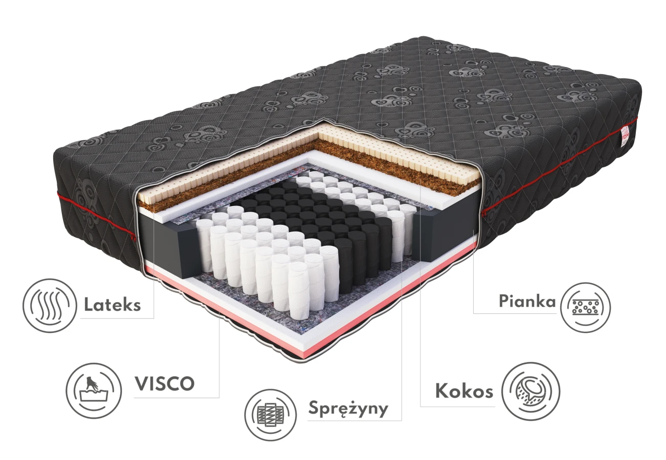 Bei der Herstellung der Matratze wird auch Latexschaum verwendet, der die Luftzirkulation in der Matratze fördert und so das Wachstum von Schimmel, Hausstaubmilben und Pilzen in der Matratze einschränkt. Ein zusätzliches Element in der Konstruktion der Matratze ist eine Kokoseinlage, die sie härtet. Die natürlichen Kokosfasern sind außerdem atmungsaktiv und erhöhen so die antiallergischen Eigenschaften der Matratze. Dank des schichtweisen Aufbaus funktioniert Black sowohl im Sommer als auch im Winter - sie sorgt für eine gute Durchblutung und thermischen Komfort unabhängig von der Jahreszeit. Jede Schicht wurde sorgfältig ausgewählt, um eine gesunde Haltung der Wirbelsäule während des Schlafs zu unterstützen. Durch die ausgewogene Kombination aus Elastizität und Weichheit passt sich die Matratze perfekt an die Körperform an und sorgt so jede Nacht für eine erholsame Nachtruhe.