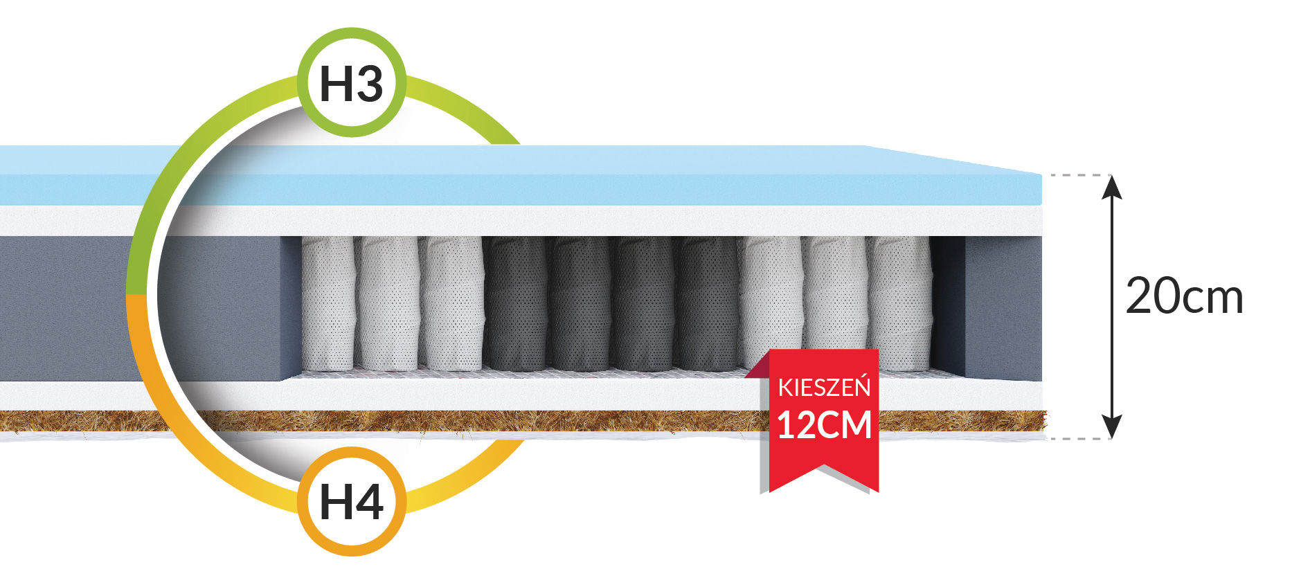 Die Laval-Taschenmatratze ist ein zweiseitiges Modell mit Härtegrad H3 mittelhart und H4 fest. Als Faustregel für die Wahl einer Matratze nach der Körperform gilt: Je höher das Gewicht der schlafenden Person, desto fester sollte die Matratze sein. Die H4-Festigkeitsseite der Matratze wurde durch eine zusätzliche Einlage aus Kokosnussschalenfasern ergänzt, die die Festigkeit erhöht. Die Fasern zeichnen sich durch eine überdurchschnittliche Haltbarkeit aus, so dass sich die Einlage auch bei starker Belastung nicht verformt. Wenn der Schläfer jedoch nach einer Nacht auf der Matratze unter Hüft- oder Schulterschmerzen leidet, empfiehlt es sich, die weichere Seite des Produkts (H3) zu verwenden. Der Schaumstoff ohne zusätzliche Kokospolsterung ermöglicht es einer leichteren Person, bequem in die Matratze "einzusinken".