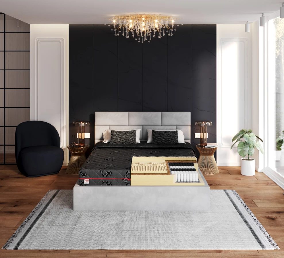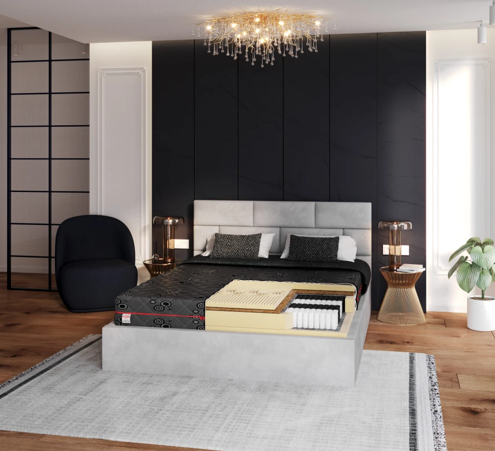 Die Taschenmatratze NEON ist eine Matratze für Liebhaber von Matratzen mit mittlerem Härtegrad - H3. Auf der einen Seite befindet sich unter dem Bezug ein Polyurethanschaum, der sich durch eine hohe Elastizität und Rückstellkraft auszeichnet und die Aufgabe hat, den Körper zu polstern. Auf der anderen Seite wird eine poröse HR-Schaumeinlage mit hoher Rückstellkraft verwendet. Der HR-Schaum zeichnet sich durch eine erhöhte Elastizität aus und verbessert gleichzeitig die Luftzirkulation in der Matratze. Die NEON-Matratze verfügt außerdem über eine Schicht aus Kokosnuss, die antimykotische und antiallergene Eigenschaften hat, den Schlafkomfort verbessert, eine gute Belüftung gewährleistet und die Haltbarkeit der Matratze erhöht. Die NEON-Matratze ist mit einem gesteppten JACQUARD-Bezug ausgestattet, der aus hochwertigen, hypoallergenen Materialien hergestellt wurde und die Lebensdauer der Matratze verlängert. Er bietet außergewöhnliche Weichheit, Frische und außergewöhnlichen Komfort und Zufriedenheit bei der Nutzung. Die schwarze Farbe ist ein einzigartiges Merkmal unseres Bezuges.