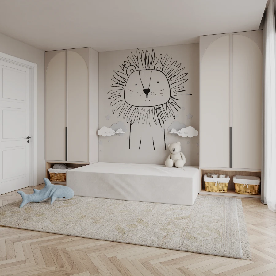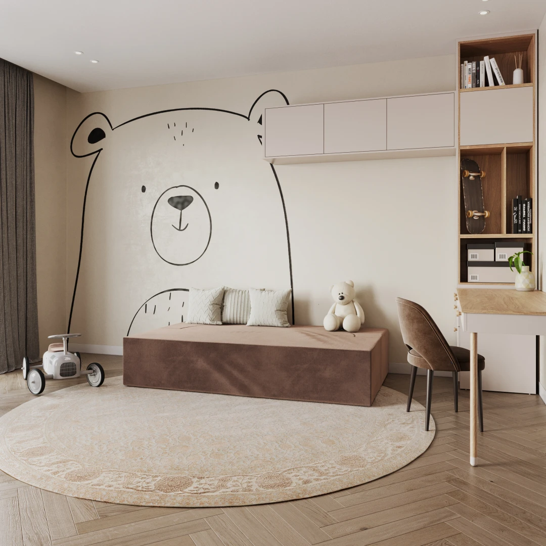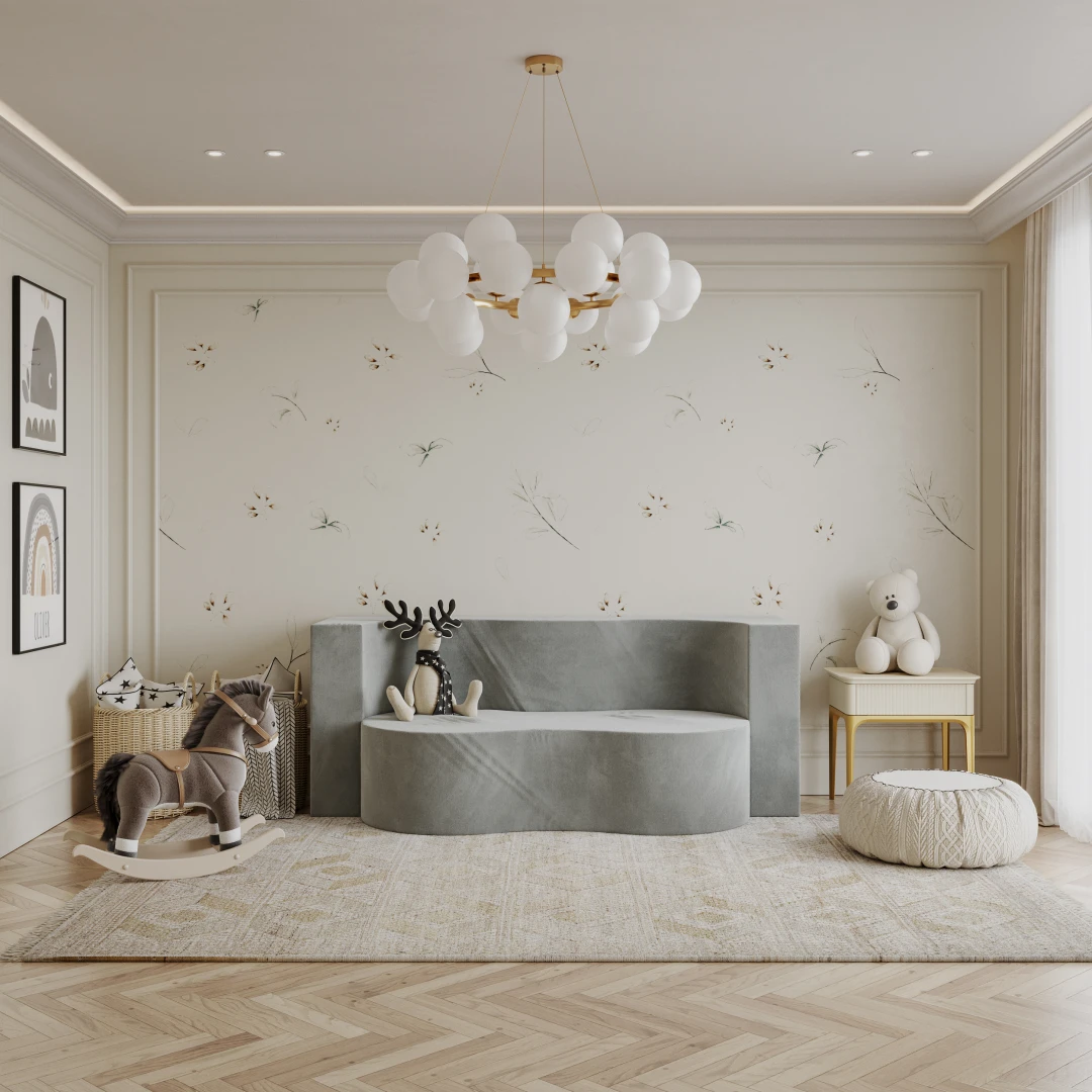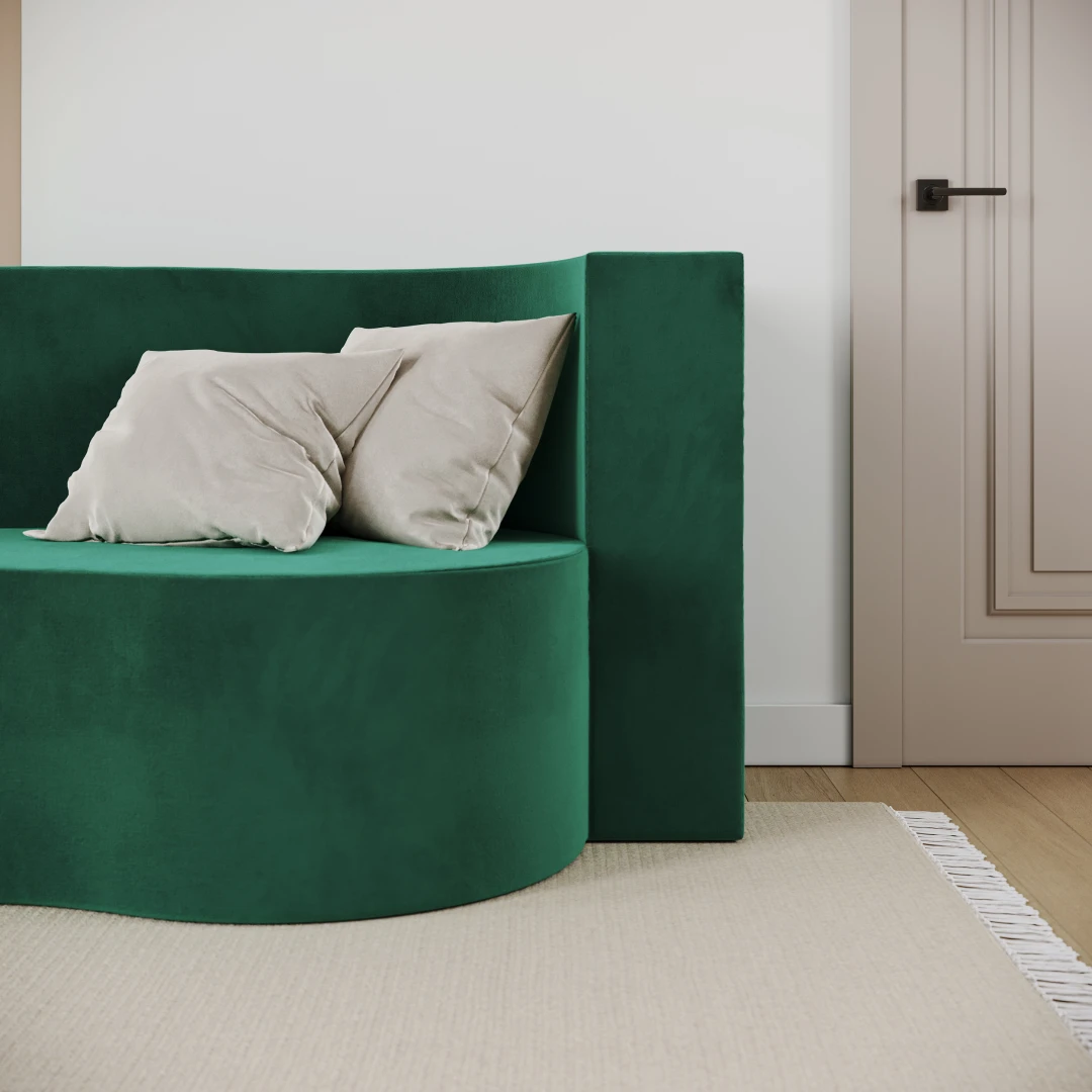 Das Innere des Sofas besteht aus hochwertigem Polyurethanschaum, der sich dem Körper anpasst, um eine optimale Unterstützung und ein bequemes Liegen zu gewährleisten. Das Material ist atmungsaktiv, flexibel und verformungsbeständig, so dass das Sofa über Jahre hinweg haltbar ist. Die weiche Eleganz des TRINITY-Stoffes - Die Polsterung ist aus einem modischen Stoff gefertigt - weichem Samtvelours, der sich angenehm anfühlt und abriebfest ist. Die Version in einem warmen Braunton wirkt elegant und dezent und passt perfekt zu natürlichen, zurückhaltenden Einrichtungen. Die grüne Version des Sofas Trinity zum Beispiel bringt Frische und einen Hauch von Kühnheit in die Einrichtung - ein Möbelstück, das nicht nur bequem ist, sondern auch ein Blickfang. Seine abgerundete, organische Form verleiht der Einrichtung Weichheit und eine subtile Modernität. Es eignet sich perfekt für ein Kinderzimmer, eine Leseecke oder einen Entspannungsbereich. Vor dem Hintergrund eines pastellfarbenen Regenbogens schafft es einen kreativen Raum, der zum Spielen und Entspannen einlädt. Kombiniert mit Holzaccessoires und weichen Stoffen entsteht ein Raum voller Wärme und Harmonie.