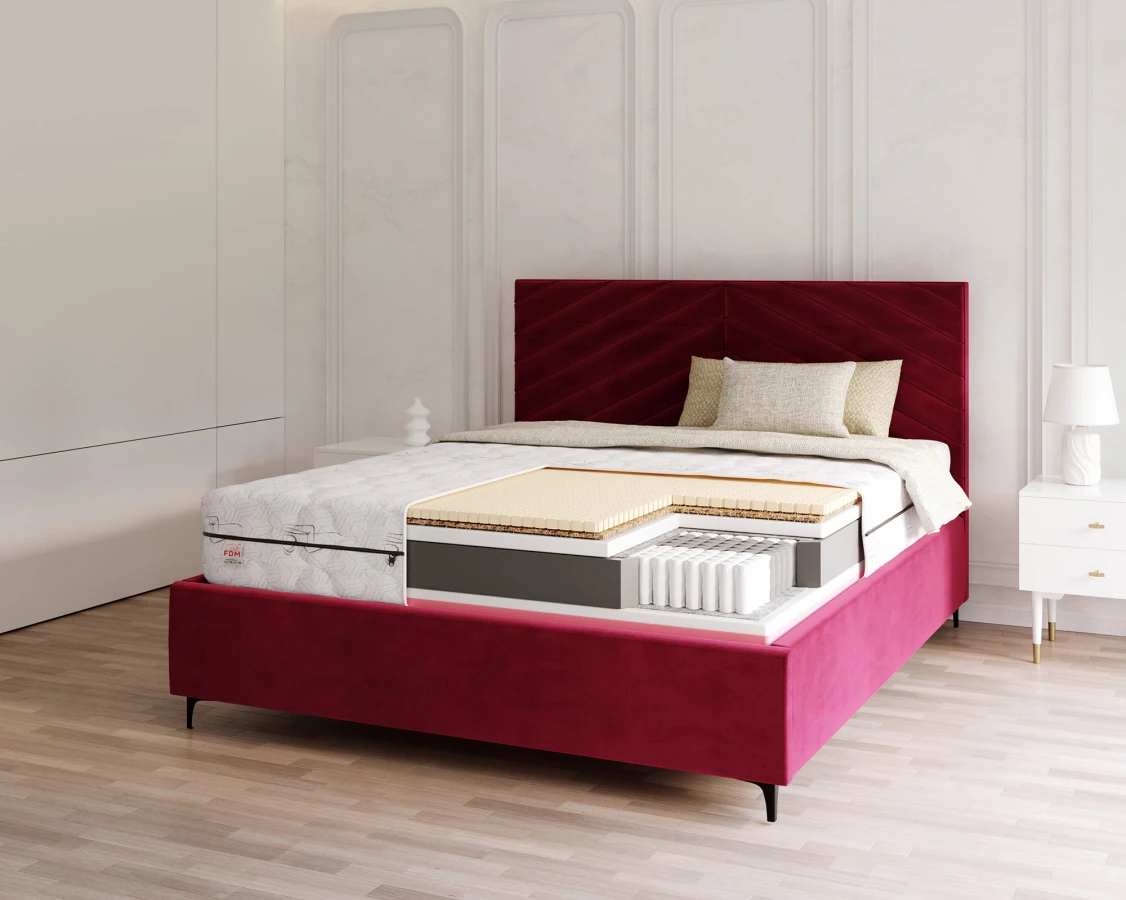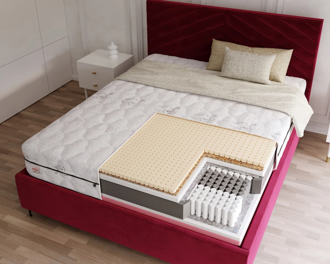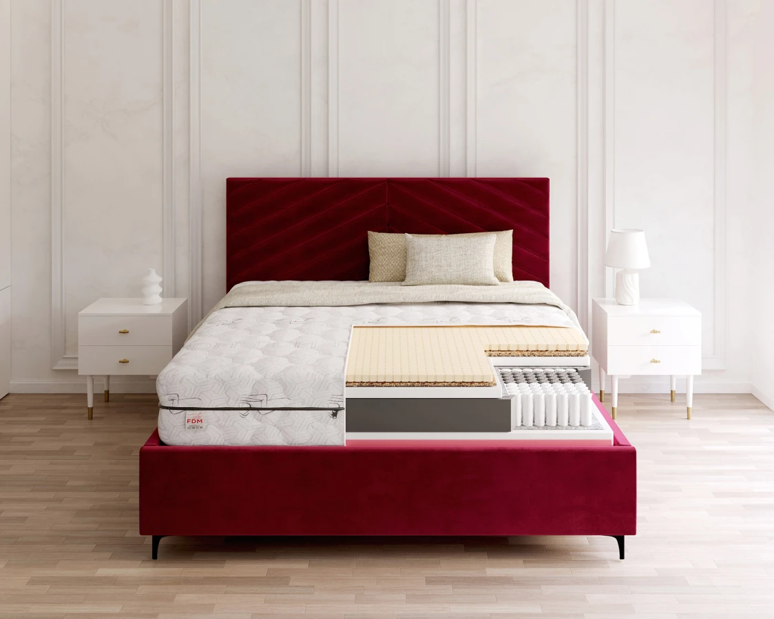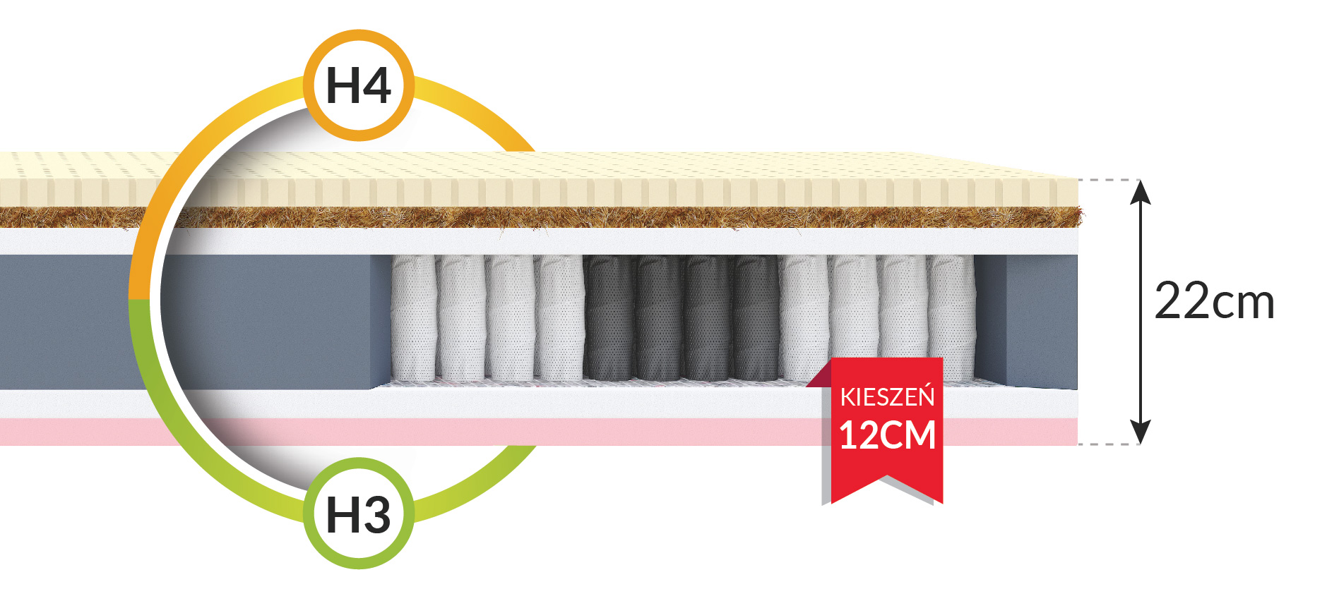 Auf der einen Seite befindet sich der thermoplastische VISCO-Schaumstoff, auf der anderen Latex und Kokosnuss. VISCO ist ein bewährter Schaumstoff, der sich dem Körpergewicht und der Körpertemperatur anpasst und den Benutzer umhüllt. Dadurch hat man das Gefühl, in sich zusammenzusinken, während gleichzeitig zu viel Druck auf müde Knochen, Muskeln und Gelenke reduziert wird. Latexschaum ist ein unglaublich strapazierfähiges Material und widerstandsfähig gegen Abnutzung und Verschleiß. Außerdem ist er bequem, weich und flexibel, was sich in einem angenehmen Schlaf bemerkbar macht. Dank seiner perforierten Struktur ist er atmungsaktiv, was zur Aufrechterhaltung der Hygiene beiträgt und das Wachstum von Schimmel, Pilzen und anderen Allergenen nicht fördert. Eine Schicht aus natürlichem Kokos trägt ebenfalls zu einer besseren Luftzirkulation bei und verhärtet den Untergrund auf einer Seite der VENETO-Matratze.