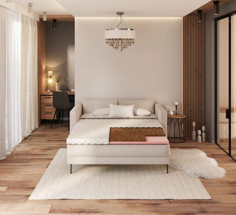 Dies ist eine doppelseitige Lösung für alle, die einen guten Schlaf wünschen. Auf der einen Seite - eine härtende Kokoseinlage, auf der anderen - weicher VISCO-Schaum, der die Wirbelsäule hervorragend stützt.