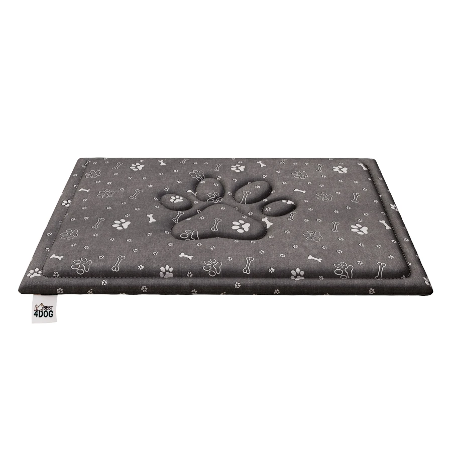 Unsere elegante und minimalistische Hundematratze zeichnet sich durch ihre rechteckige Form aus, wodurch sie leicht zu transportieren ist und Ihrem Hund ermöglicht, sich an verschiedenen Orten auszuruhen. Sie ist mit dunklem Stoff mit Hundemotiven bezogen und passt in verschiedene Räume.